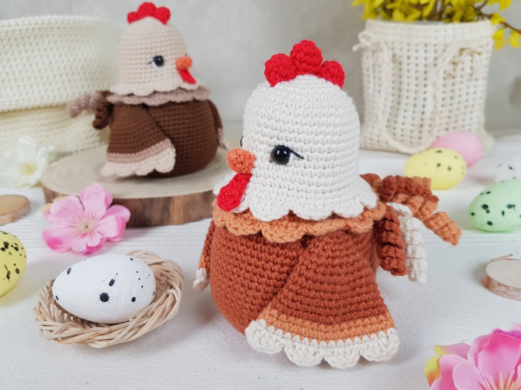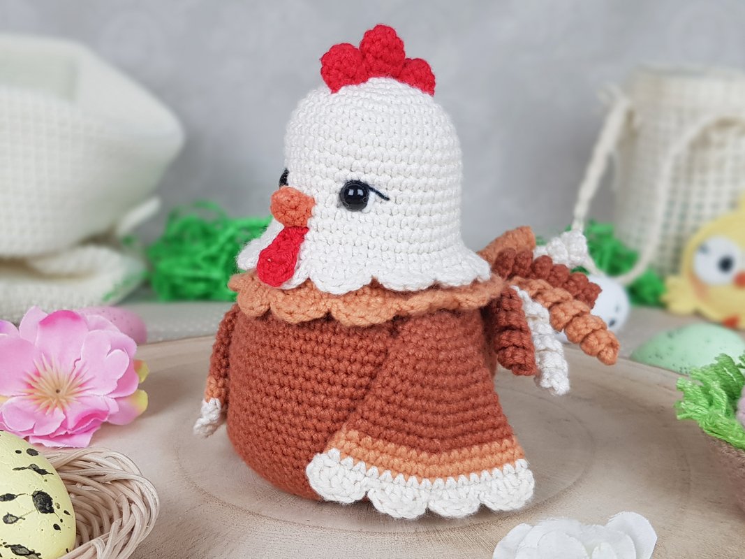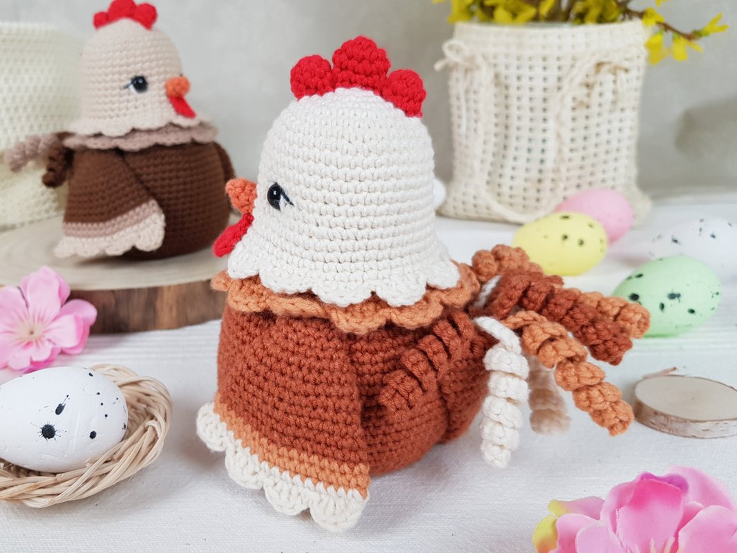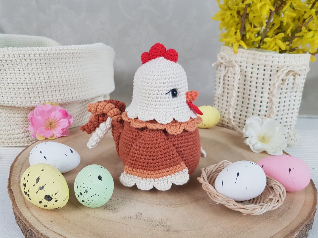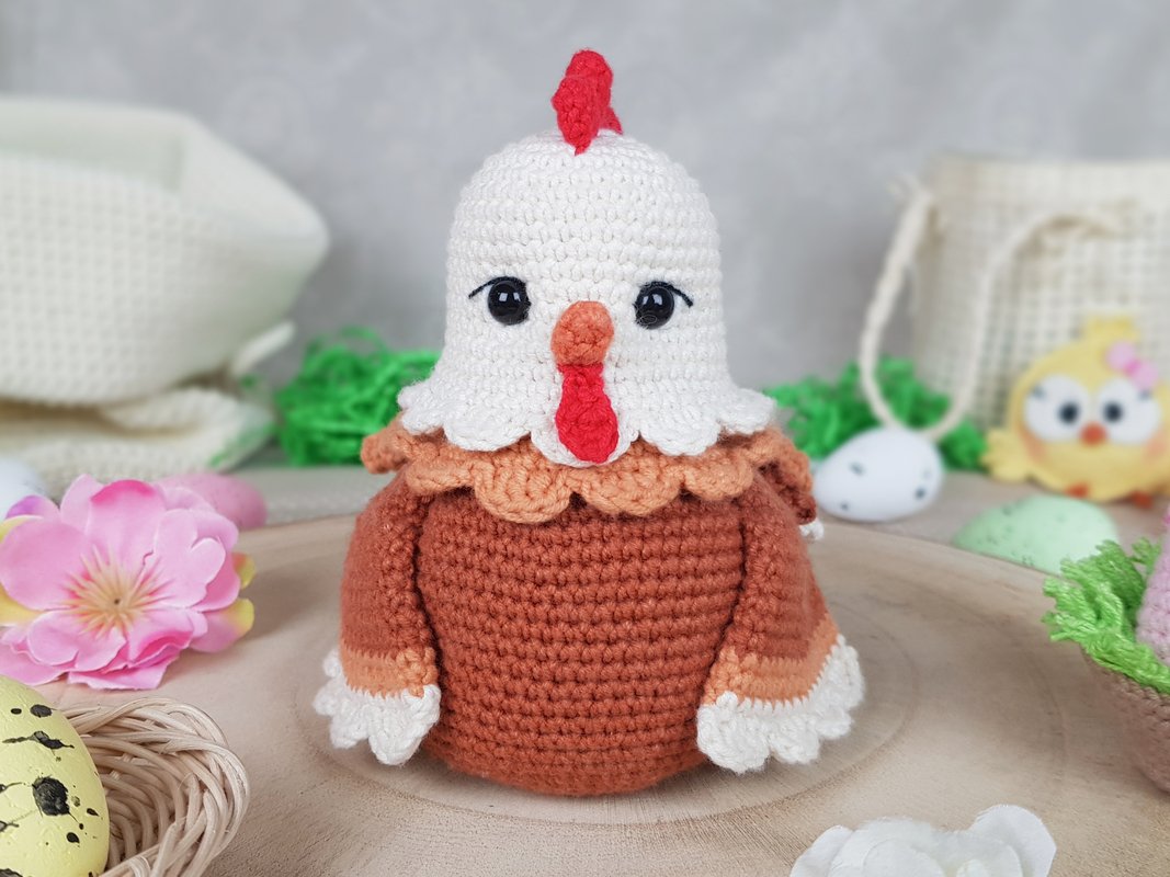 Letztes Jahr habe ich Henrietta die Osterhenne gehäkelt. Es war weiß und ziemlich groß und meine Kinder wollten dieses Jahr eine kleinere Henne von mir. Und da es zu Ostern nie genug Hühner gibt, habe ich mich entschieden, noch eins zu häkeln. Ich habe ziemlich lange darüber nachgedacht, weil ich sie perfekt machen wollte.. und das, jedes Teil! Am Ende gefällt sie mir sehr gut. Sie ist klein (13 cm hoch), nicht weiß, daher sieht sie länger sauber aus (mindestens ein paar Tage :-)) und passt in jedes Zuhause!