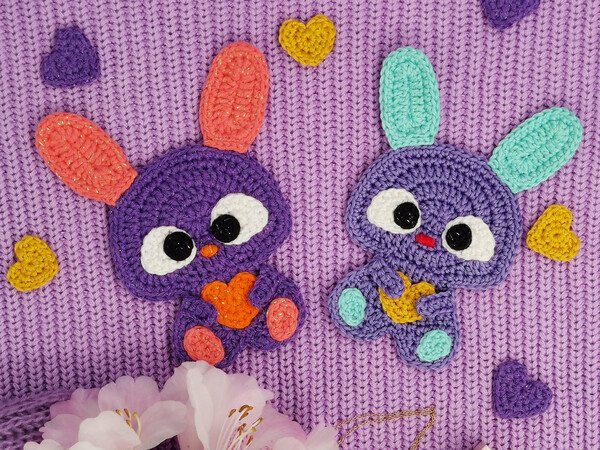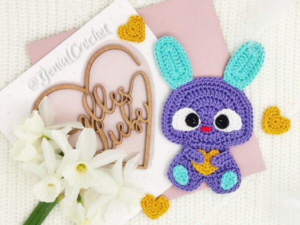 Die Häkelanleitung enthält Schritt-für-Schritt-Beschreibungen zum Häkeln der Hasenapplikation, zum Sticken einer Nase, Tipps und Fotos zur Verarbeitung. Die Häkelanleitung enthält Anweisungen für Rechtshänder.
