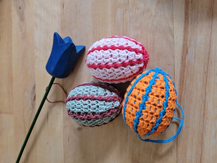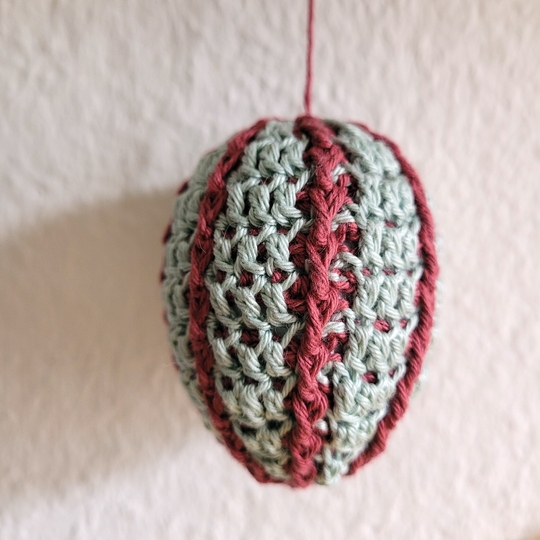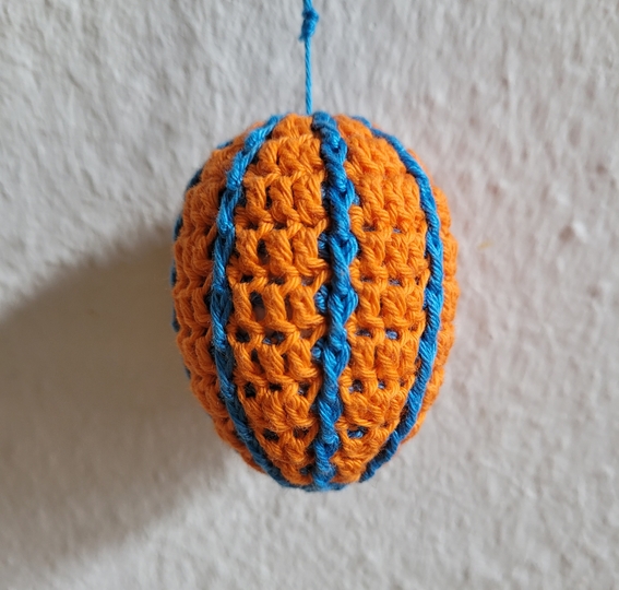 Auch mit Längsstreifen lassen sich sehr schöne Ostereier umhäkeln. In der Zeit vor Ostern gibt es in vielen Discountern Kunsstoff Eier zum selber gestalten. Die habe ich mir gekauft und sie dann mit dünnem Garn so umhäkelt, dass es eine geschlossene Hintegrundfarbe ergab mit Längsstreifen in einer beliebigen Kontrastfarbe.