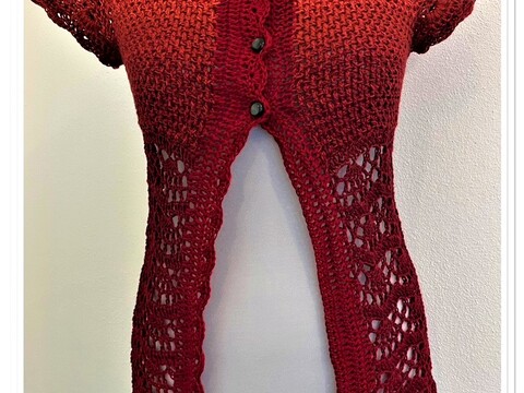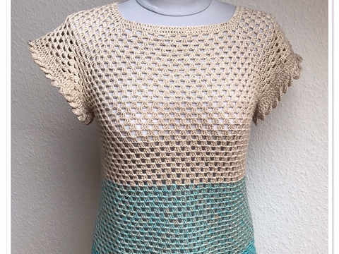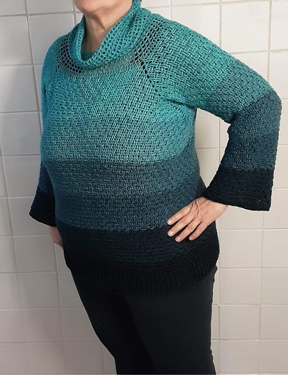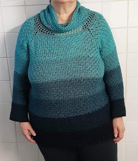 Der Schalpullover wird als RVO (Raglan von oben) in Runden gehäkelt. Er beginnt mit dem Schal und wird von dort aus in Reihen ohne zu wenden nach unten gehäkelt. Der Schal wird im Lochmuster gehäkelt und der Torso und die Ärmel im Korbmuster. Das Korbmuster wird am Ende der Anleitung genau erklärt.