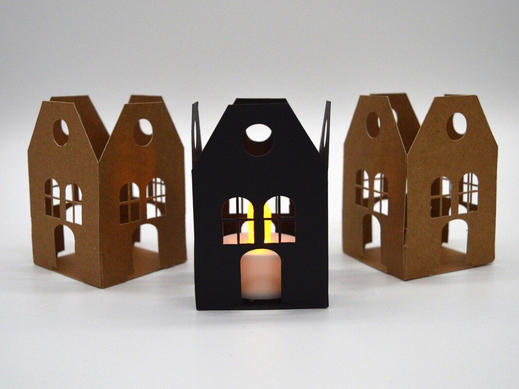 Geschnitten und gefalten aus Karton/ Kraftkarton ergeben es süße, kleine Häuser, in die ein LED Licht gestellt werden kann.