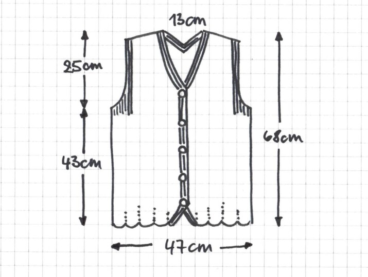 Die Weste ist mit der angegebenen Maschenprobe 30M und 40R = 10cm für Grösse 36/38 beschrieben.