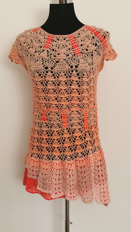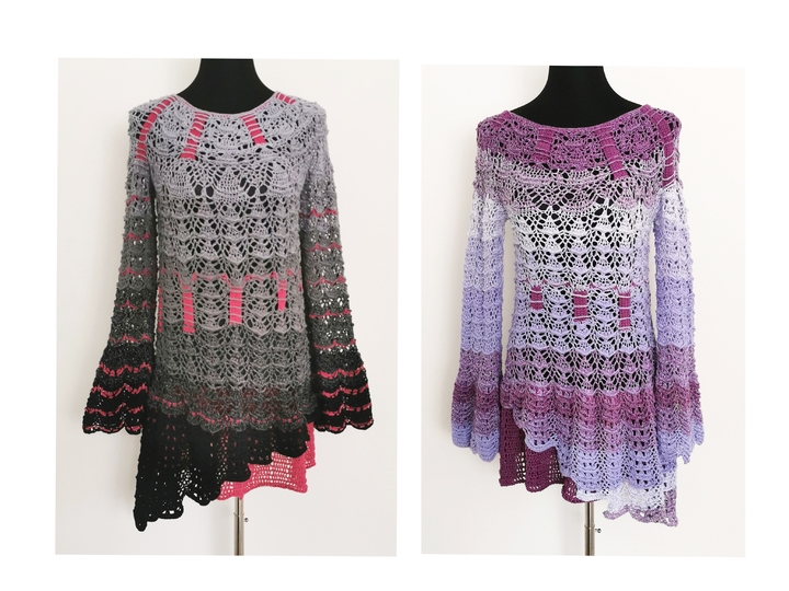 Libellina ist eine sehr aussergewöhnliche, romantische Tunika, die aufgrund der ausgefallenen Muster, der eingehäkelten Blöcke in Kontrastfarbe und der schrägen Form am Abschluß ein absoluter Hingucker ist.