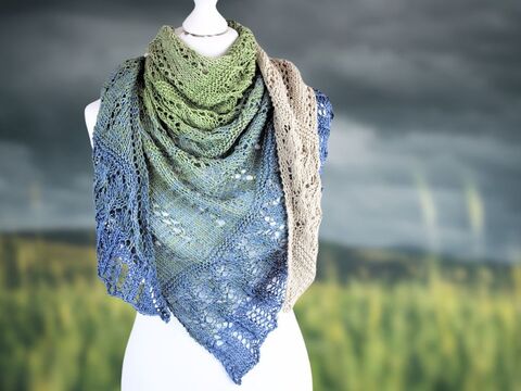 Abhängig von deiner Wolle, Nadelstärke und Strickweise wird das Tuch etwa 160 bis 192 cm lang und etwa 70 bis 85 cm hoch. Du kannst es noch verlängern, indem du eine Bordüre anhäkelst oder Fransen anknüpfst.