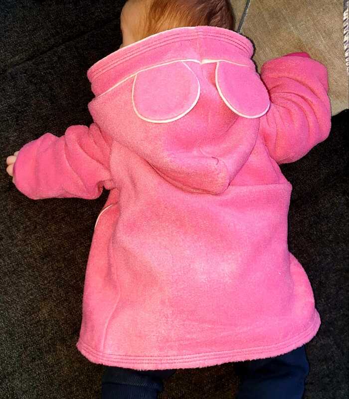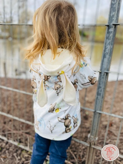 Vorn mit einer tollen Teilung und integrierter Tasche, mit verschiedenen optionalen Öhrchen an der Kapuze: Hase, Fuchs, Katze, Bär, Mäuschen, … deiner Fantasie sind keine Grenzen gesetzt!