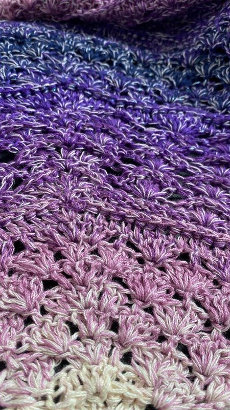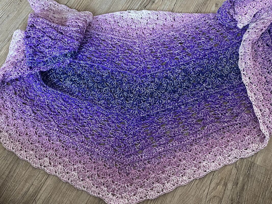 Wer auf Muschelmuster steht wird Lilac lieben! Durch gleich 2 Muschelmuster bietet dieses flache Dreieckstuch mit geschlossener Mitte in 5 Abschnitten Abwechslung beim häkeln.