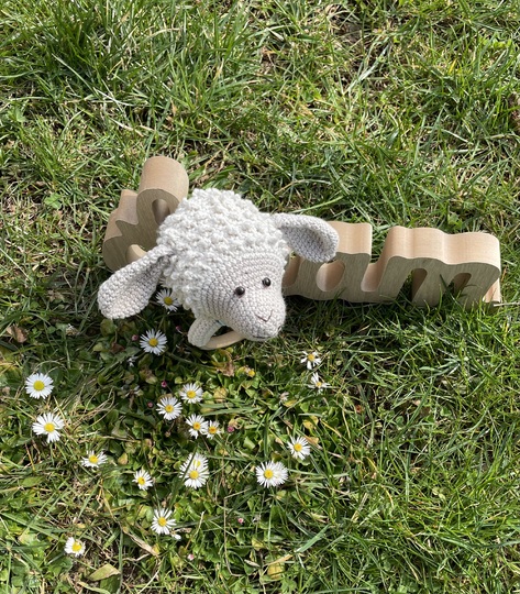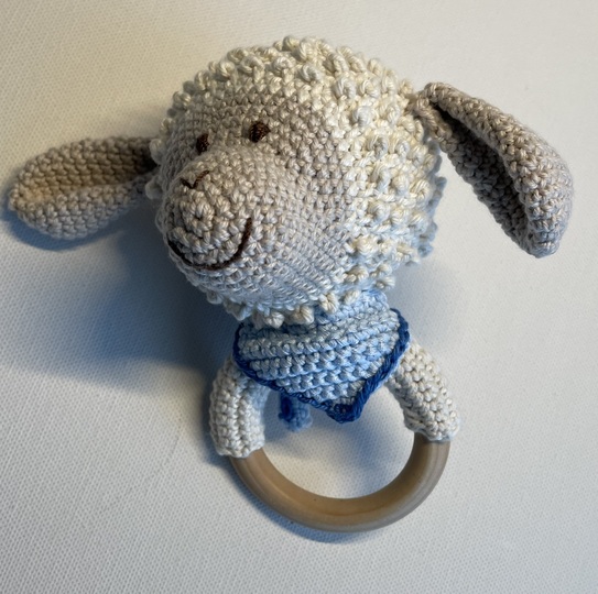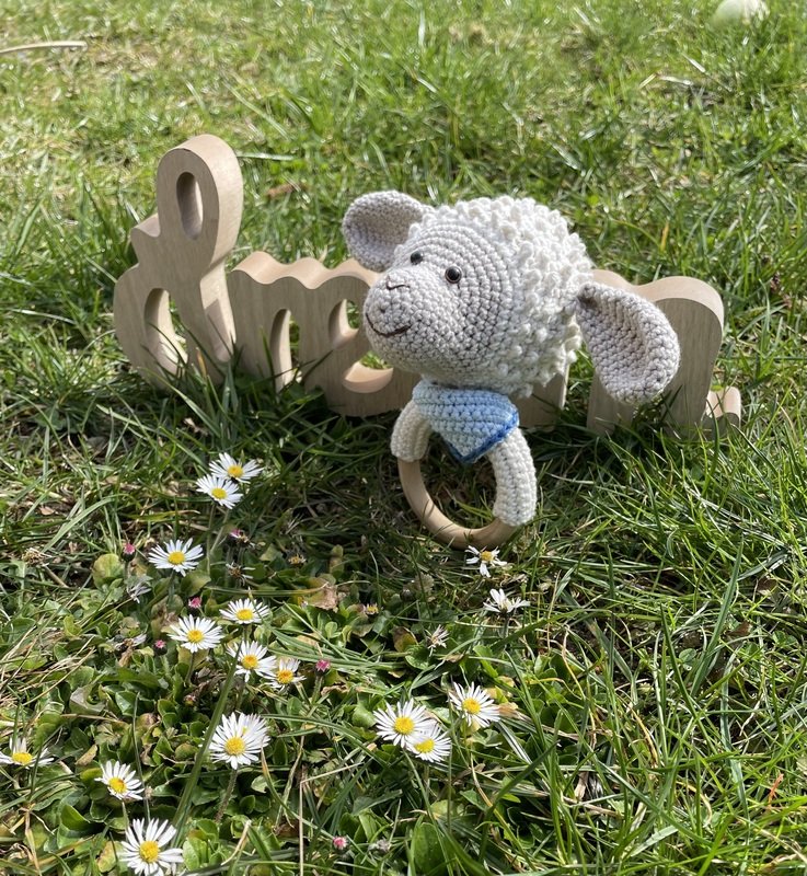 Das ist Mila, das süße Rasselschäfchen mit einem tollen Greifring aus Holz. Mila besteht weitestgehend aus festen Maschen und Luftmaschen und sollte auch für Anfänger gut zu schaffen sein. Falls du Fragen hast kannst du dich gerne bei mir melden, ich helfe sehr gerne weiter.