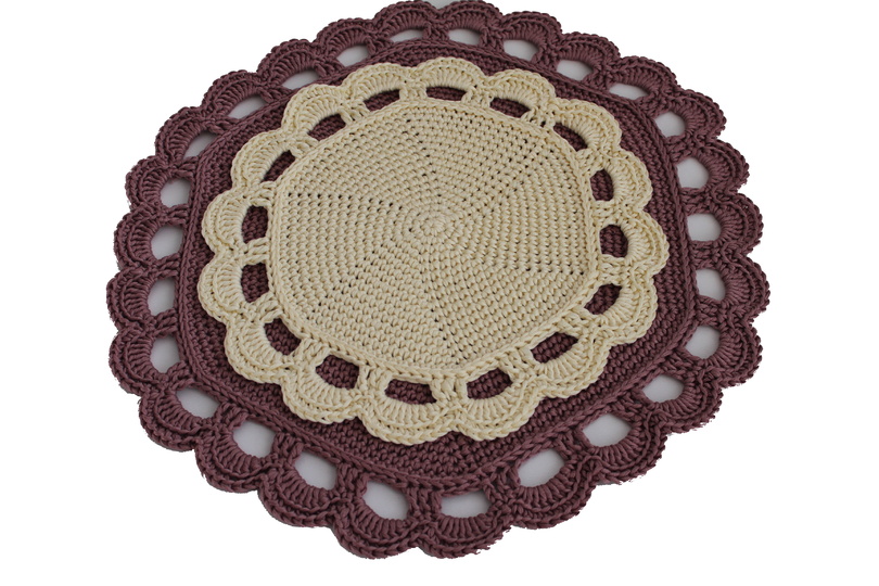 z. B. Baumwollgarn DROPS Qualität „Muskat“ in 50g ca. 100 m. Häkelnadel 4 mm.