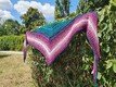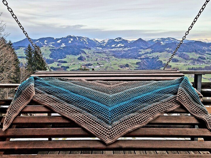 1500 m, 4-fädig mit Nadelstärke 3,75 gehäkelt, ergaben eine Tuchgröße von 212 x 55 cm.