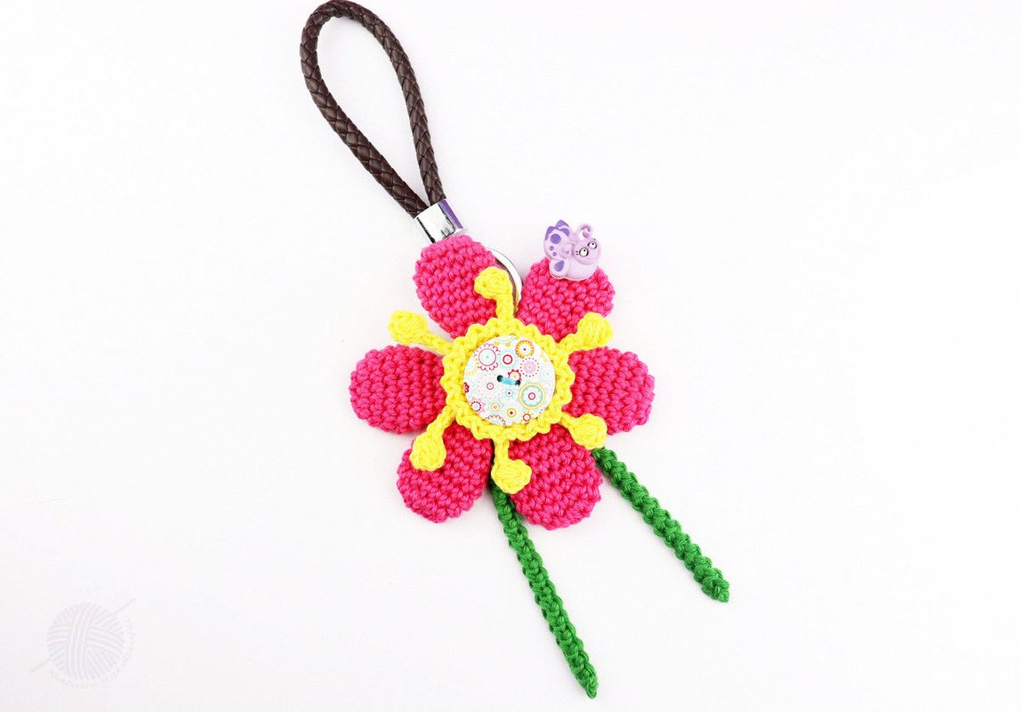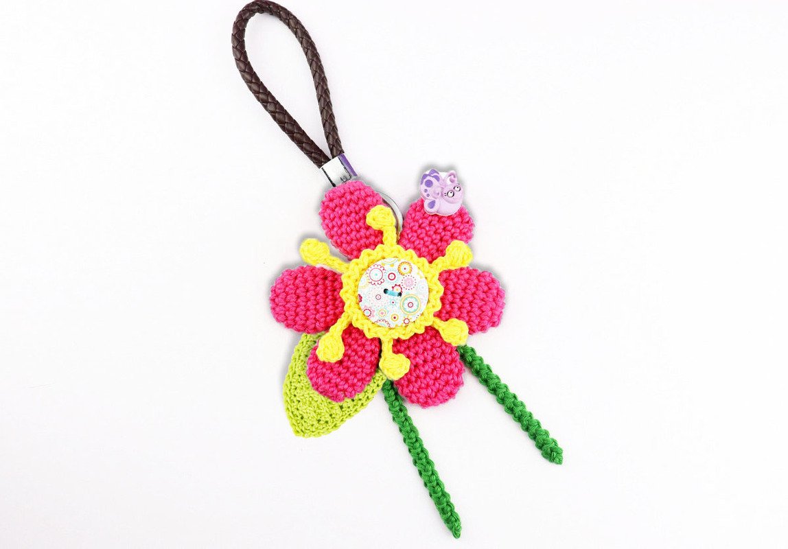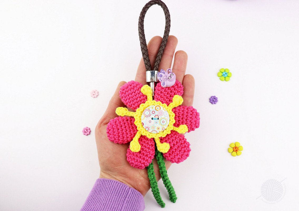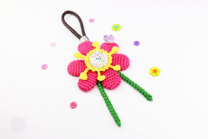 Umfangreiche, reichlich bebilderte PDF-Häkelanleitung zum Häkeln eines Anhängers "Blume" (Blume, Blatt, Kordel) zum Dekorieren des Hauses oder als Mitbringsel für die Freunde. Diese Blume kann man auch als Dekoration oder Anhänger für die Tasche benutzen.