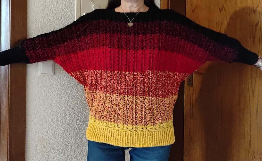 Der Fledermauspullover ist individuell auf jede Kleidergröße anpassbar.