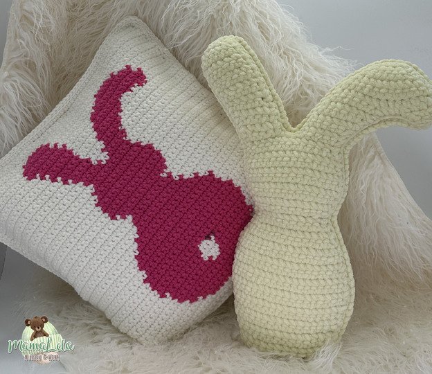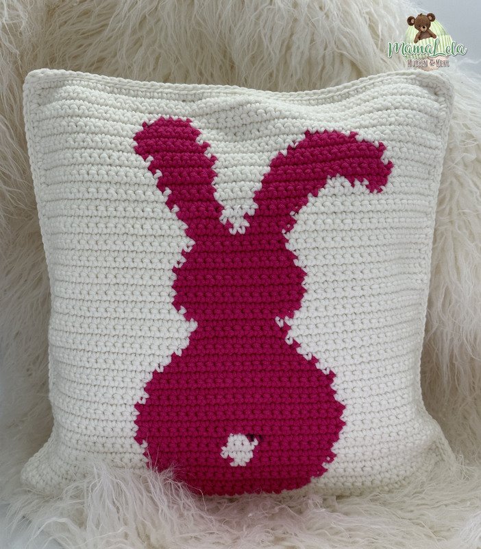 Mit dieser Häkelanleitung könnt ihr euch das im Artikelbild gezeigte quadratische Motivkissen und/oder das Kuschelkissen in Hasenform zaubern.
