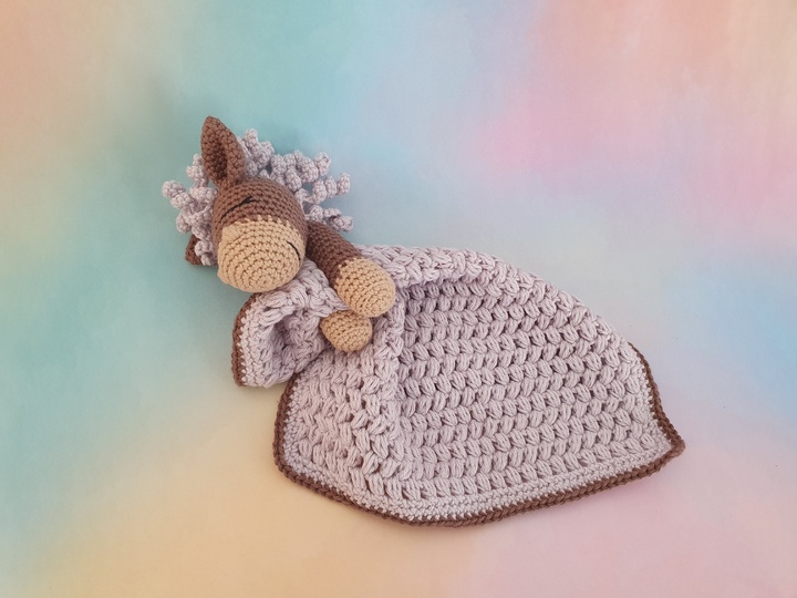 SCHMUSETUCH: Mit den angegebenen Materialien misst das fertige Schmusetuch ca. 25 x 25 cm (nur das Tuch). Hinzu kommt noch ein ca. 8 cm grosser Pferdekopf.