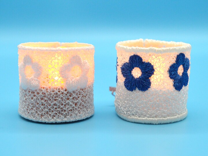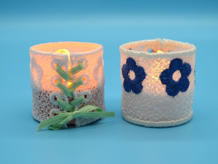 Dazu ist ein Teelichthülle enthalen. Hier wird auf der Rückseite der Stickerei nach dem Auswaschen des Vlieses ein Bändchen durch die Öffnungen geflochen und mit einem Schleifchen verschlossen.