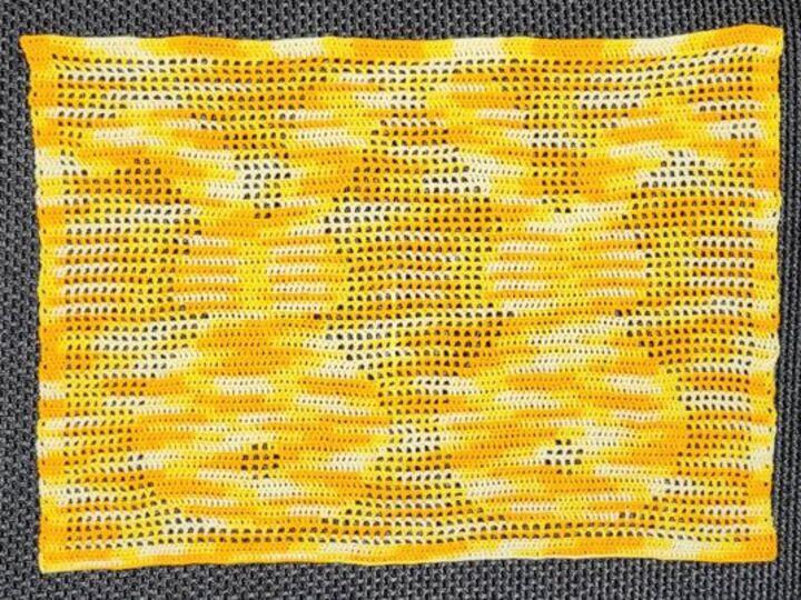 Dieser ist stark davon abhängig wie „kompakt“ das Motiv ist (Verteilung gefüllte/leere Kästchen) und wie fest oder locker ihr häkelt und welches euer favorisiertes Garn ist.
