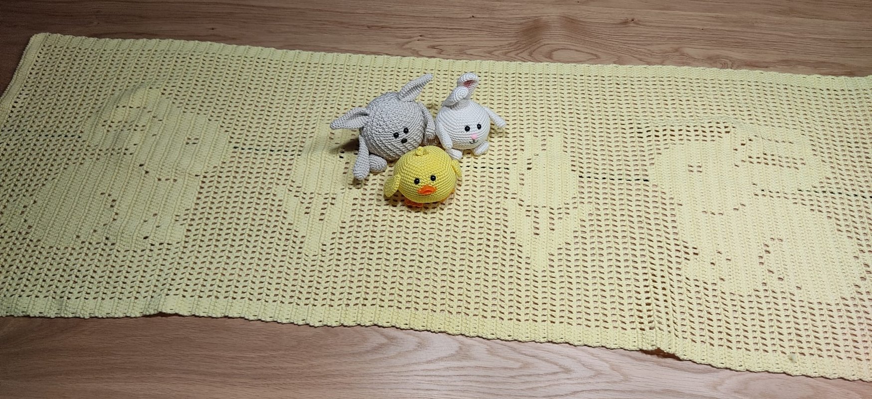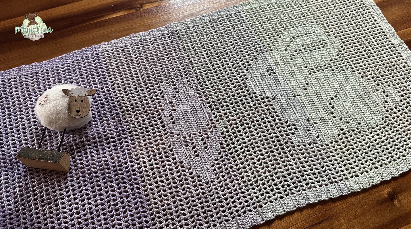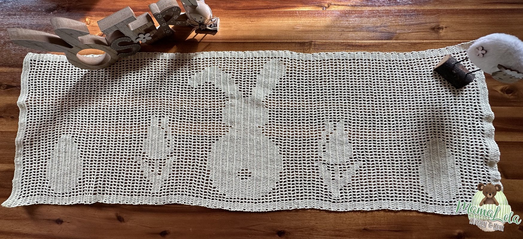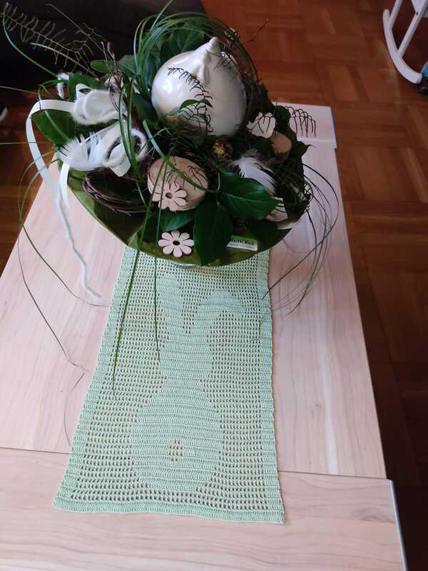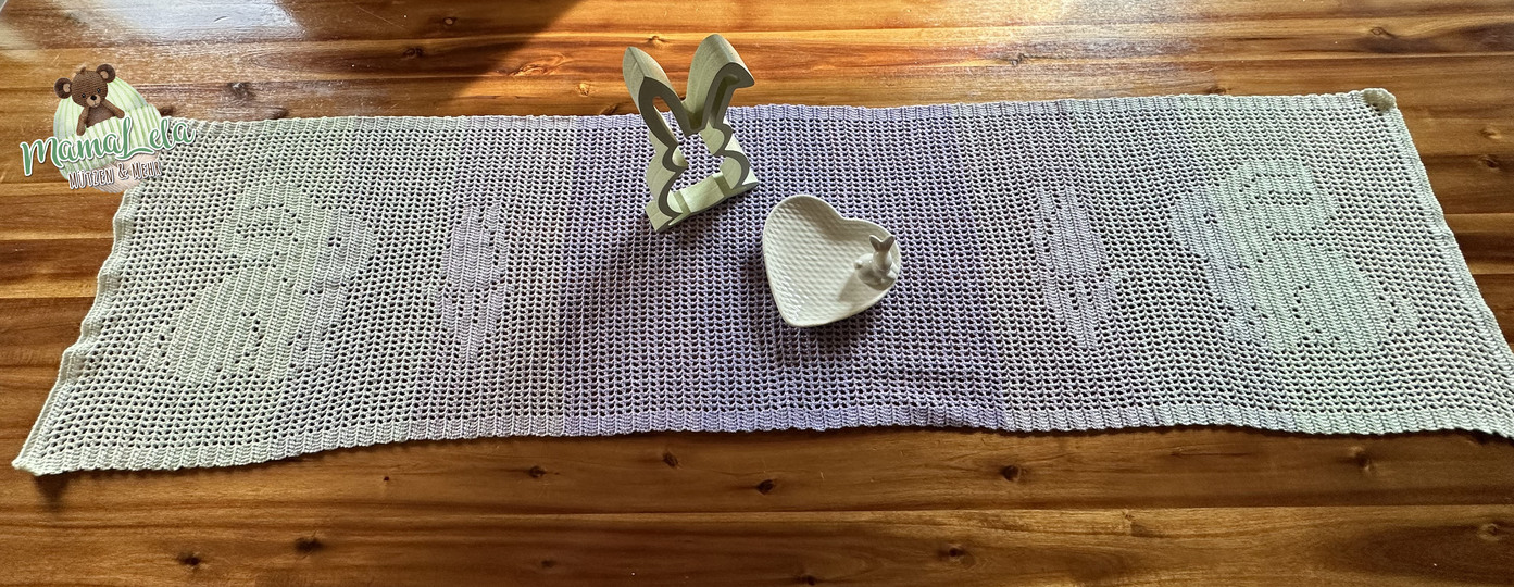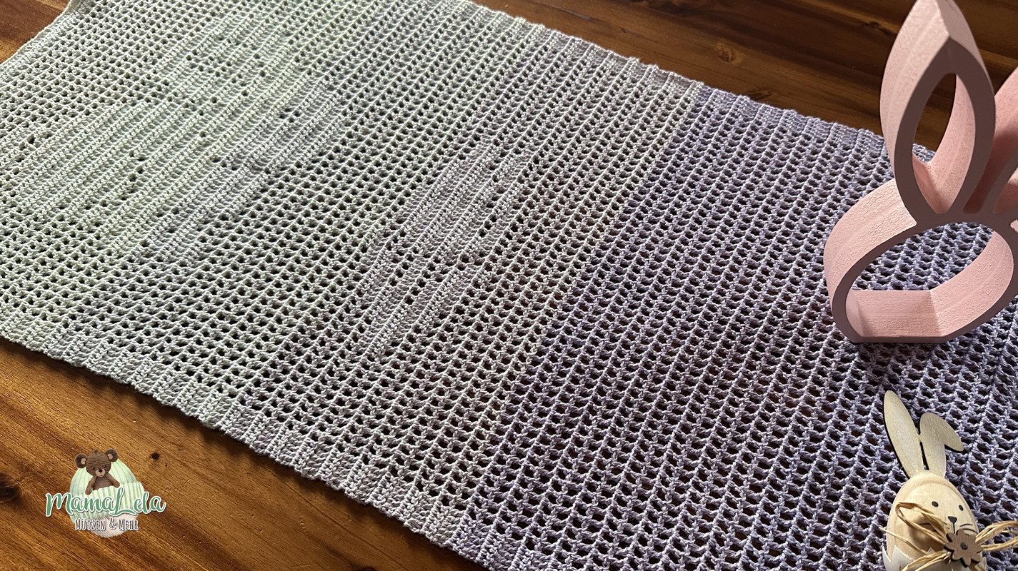Es sollte etwas Schlichtes werden, das unseren großen Esstisch nicht nur zu Ostern schmückt und trotzdem genug Platz drumherum lässt. Was lag da näher als ein Tischläufer?! Ein Projekt, welches wirklich schnell umgesetzt werden kann. Zudem lässt es sich aus fast jedem Garn arbeiten und ist somit ein ideales Zwischendurchprojekt.