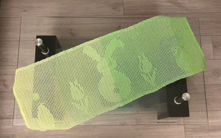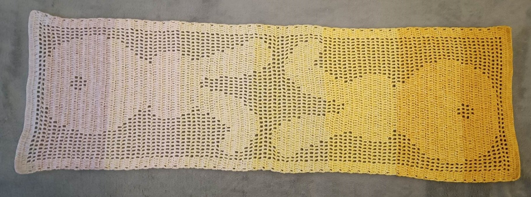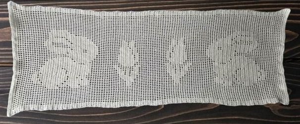 Mit den von mir verwendeten Bobbel wurde der Tischläufer 37 x 136 cm und der Tischläufer aus Filetgarn wurde 30 x 90 cm groß. (Alle Angaben sind im ungespannten Zustand.)