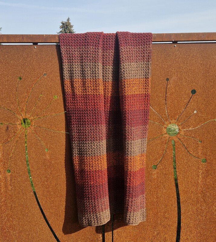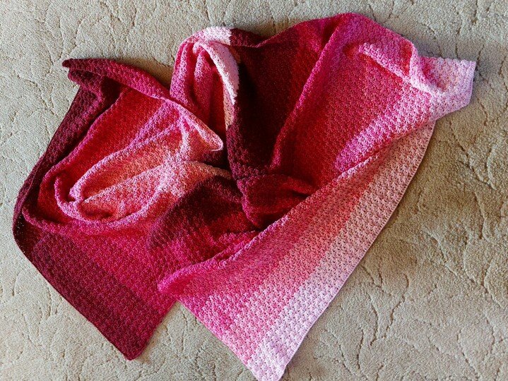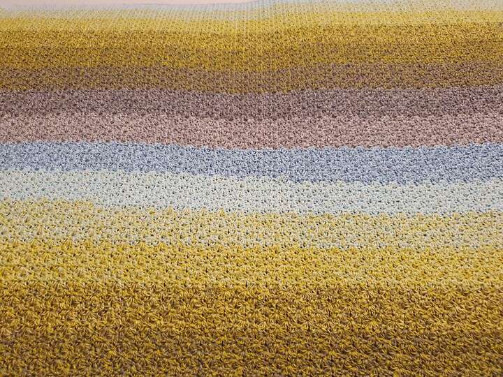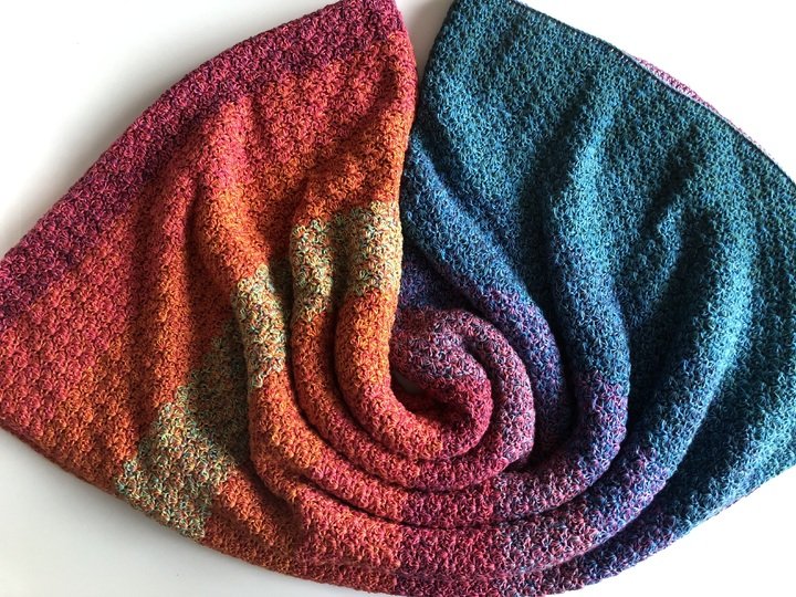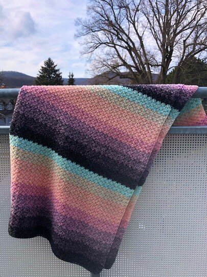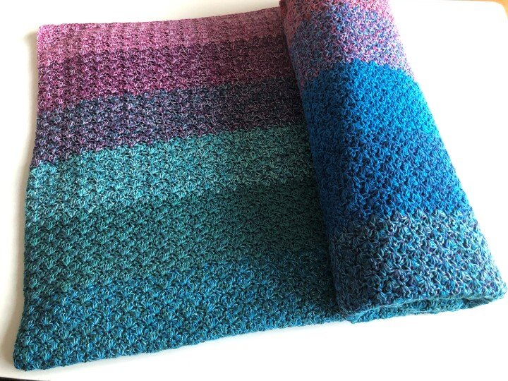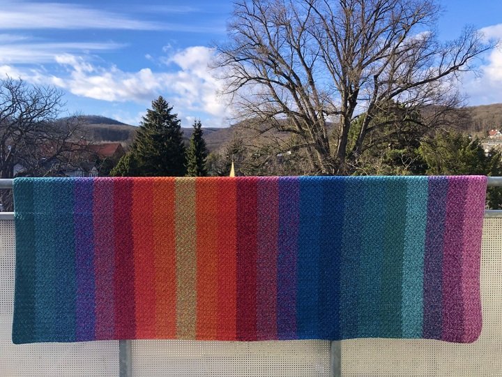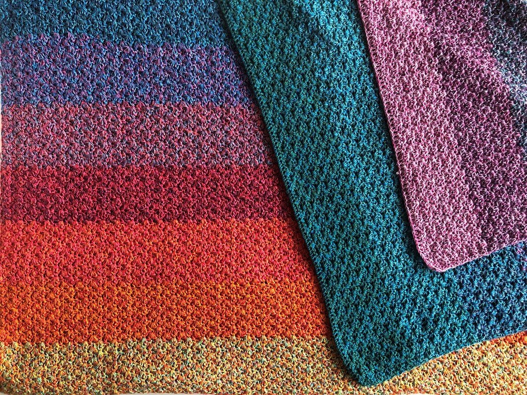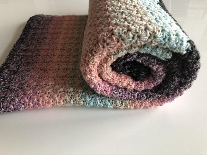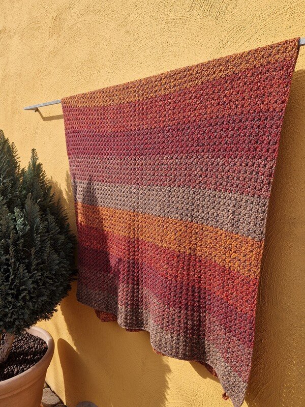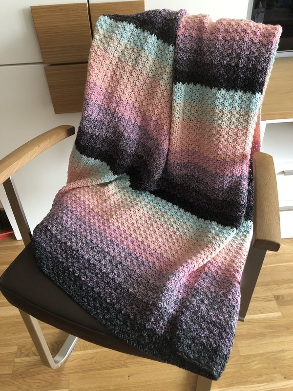 Bei Farbverlaufsgarn empfehle ich je nach Wunschgröße und Häkelstil für eine Babydecke eine Lauflänge ab 2000 m 4-fädig bzw. 1500 m 5-fädig, für eine größere Decke sind je nach gewünschter Größe rund 4000 bis 6000 m 4-fädiges Garn notwendig.