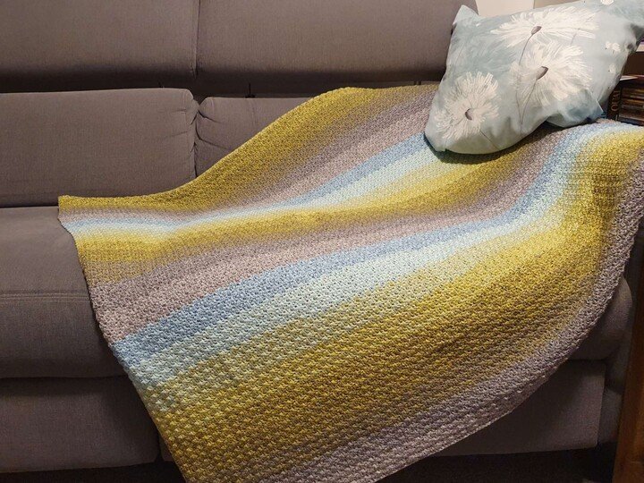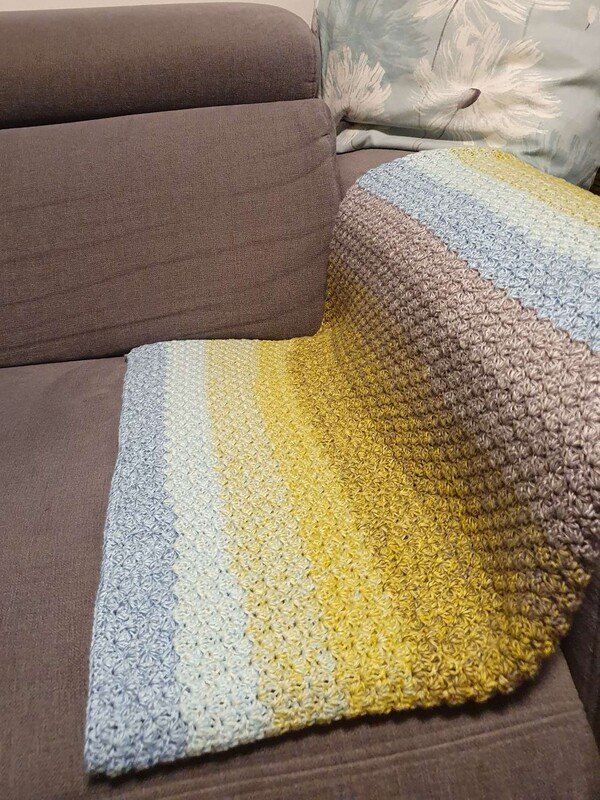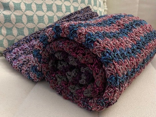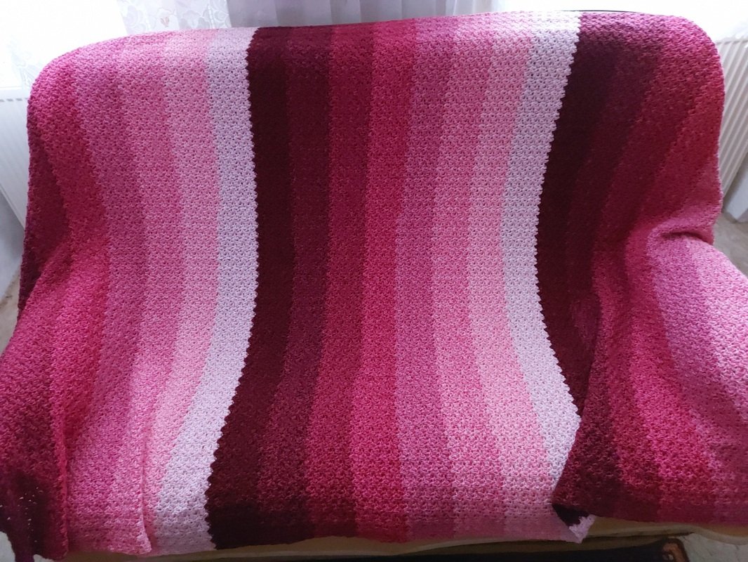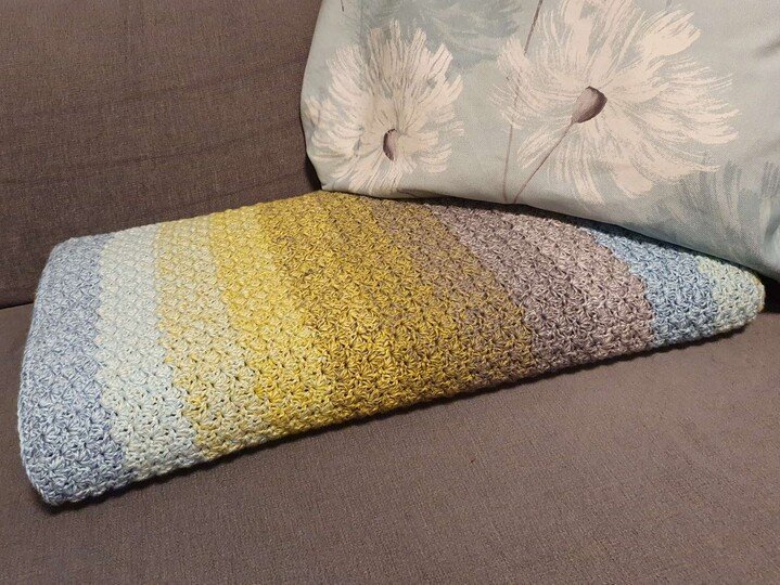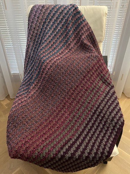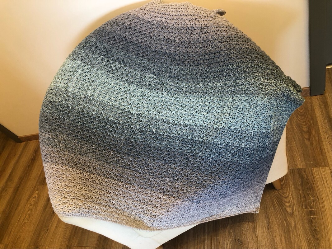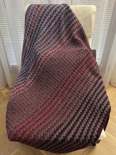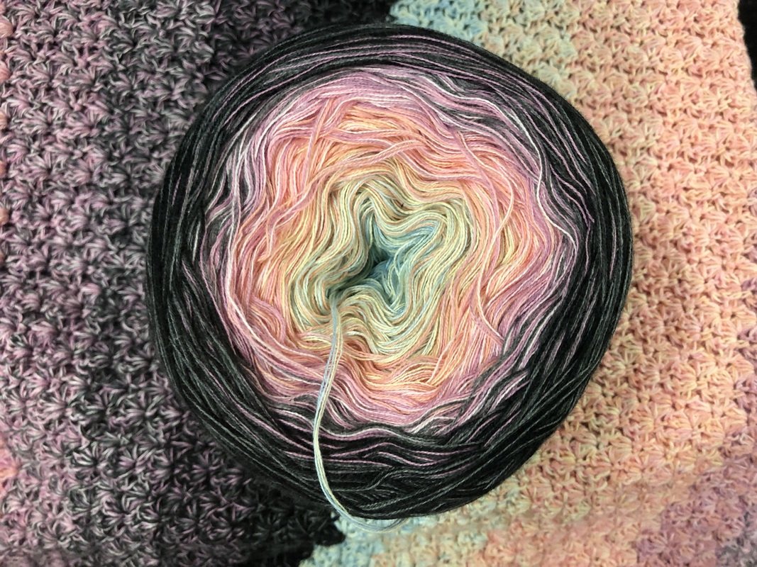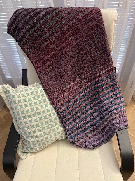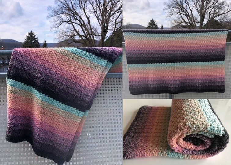 Bei Farbverlaufsgarn empfehle ich je nach Wunschgröße und Häkelstil für eine Babydecke eine Lauflänge ab 2000 m 4-fädig bzw. 1500 m 5-fädig, für eine größere Decke sind je nach gewünschter Größe rund 4000 bis 6000 m 4-fädiges Garn notwendig.