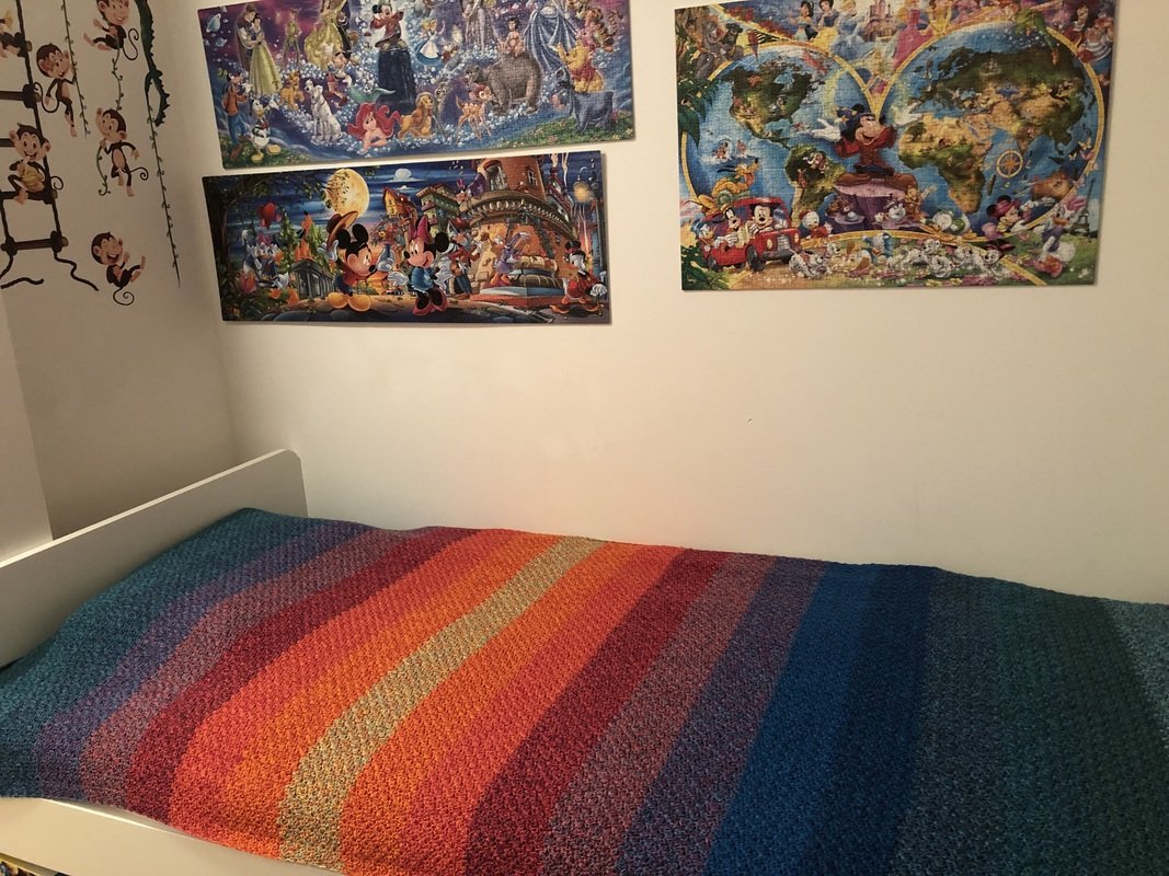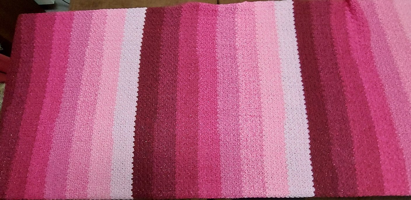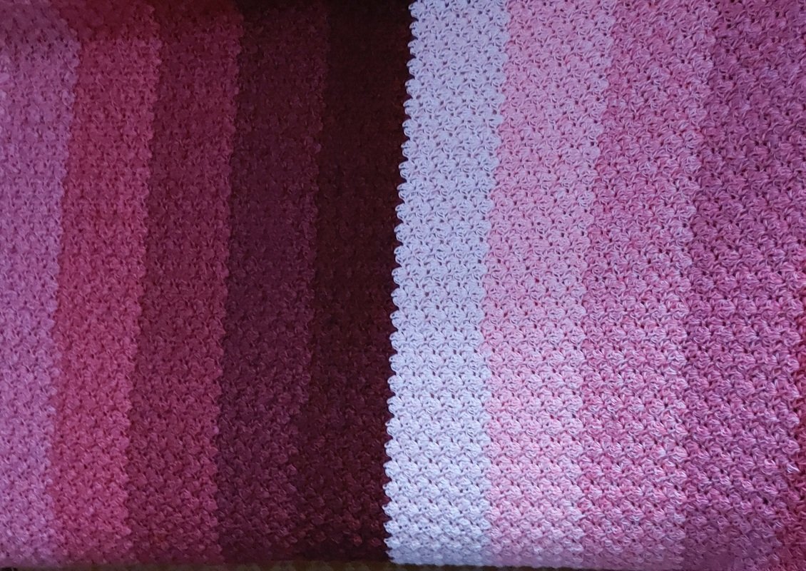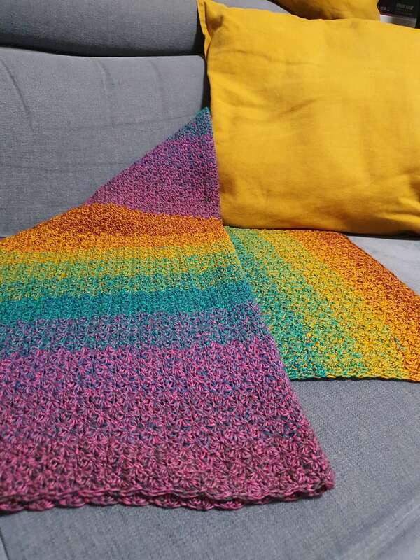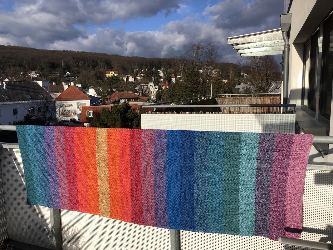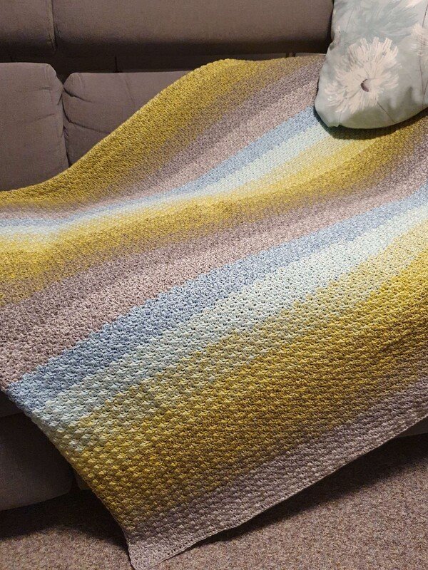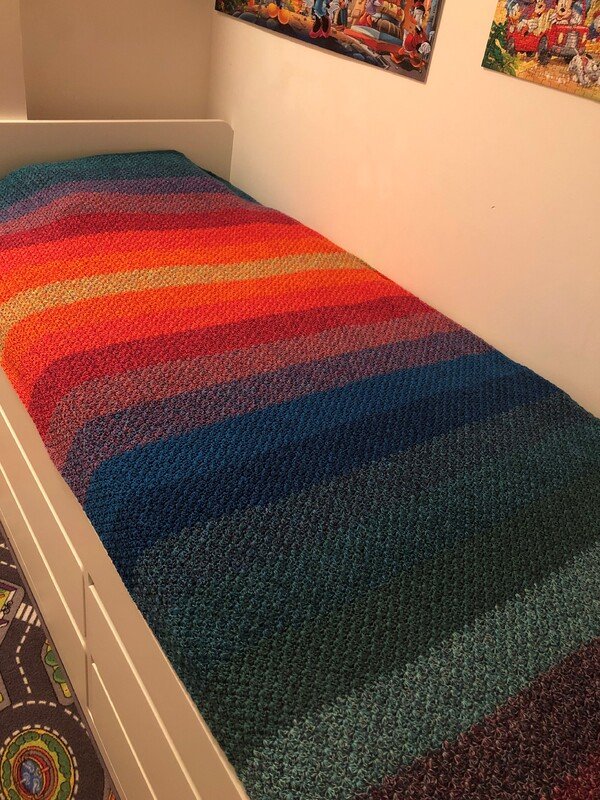 Bei Farbverlaufsgarn empfehle ich je nach Wunschgröße und Häkelstil für eine Babydecke eine Lauflänge ab 2000 m 4-fädig bzw. 1500 m 5-fädig, für eine größere Decke sind je nach gewünschter Größe rund 4000 bis 6000 m 4-fädiges Garn notwendig.