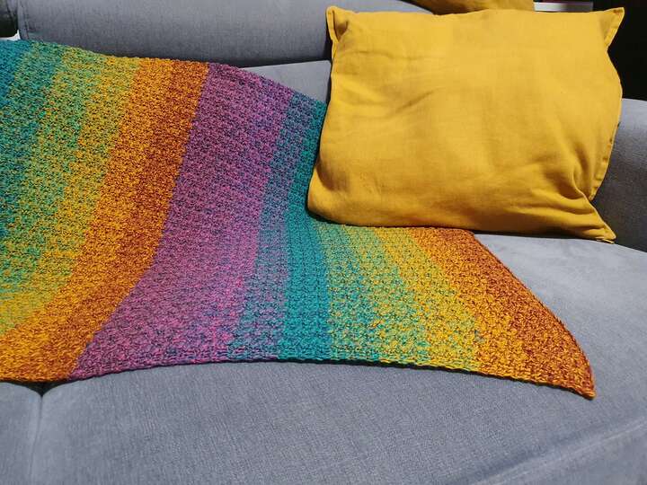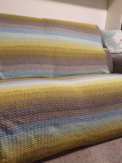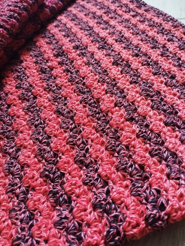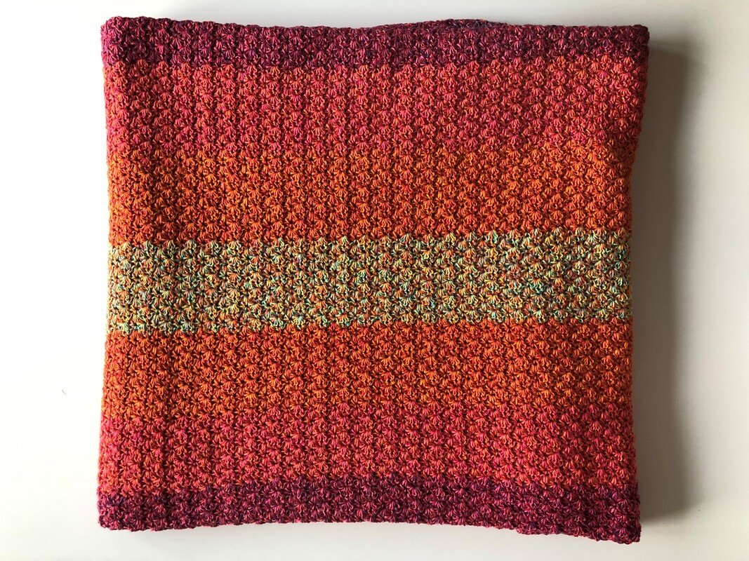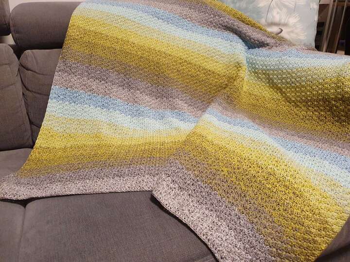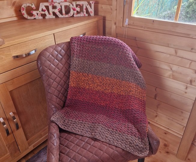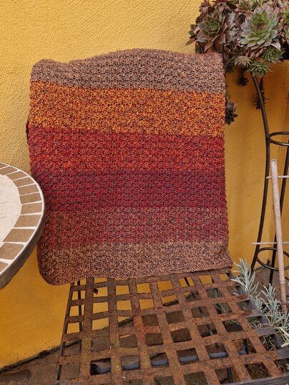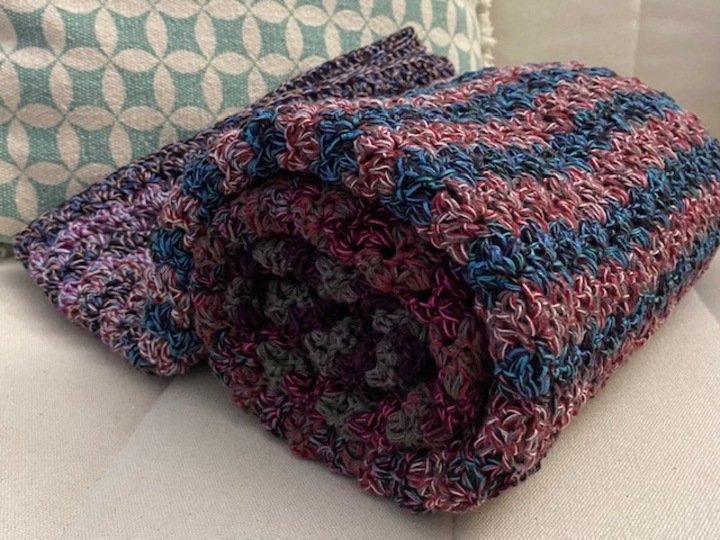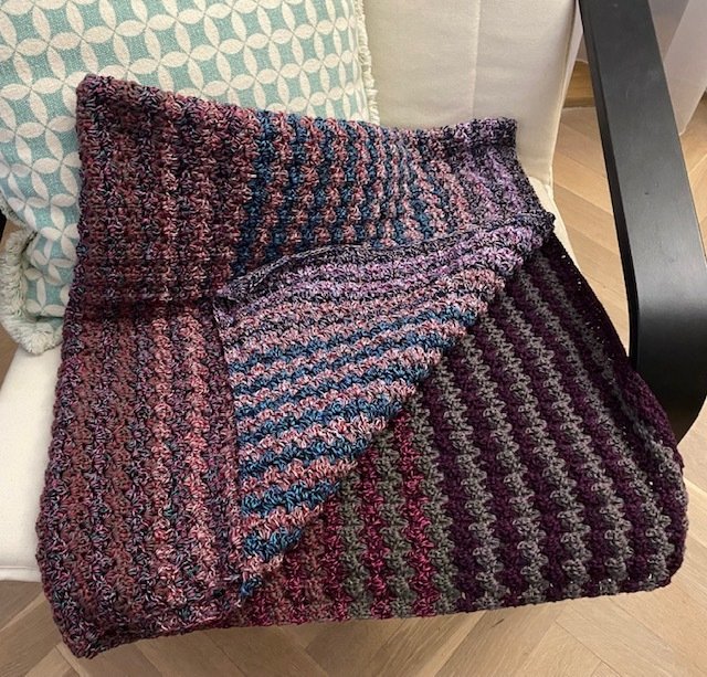 Das Muster der Häkeldecke Meditation Blanket ist einfach und effektvoll, wird in Reihen gehäkelt und ist ideal für Bobbel und Resteverwertung. Du kannst dir auch einen schicken Schal oder eine Stola mit dem Muster häkeln.