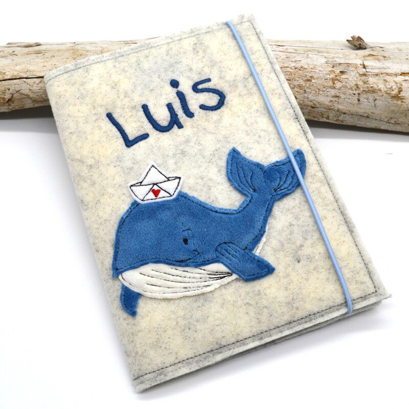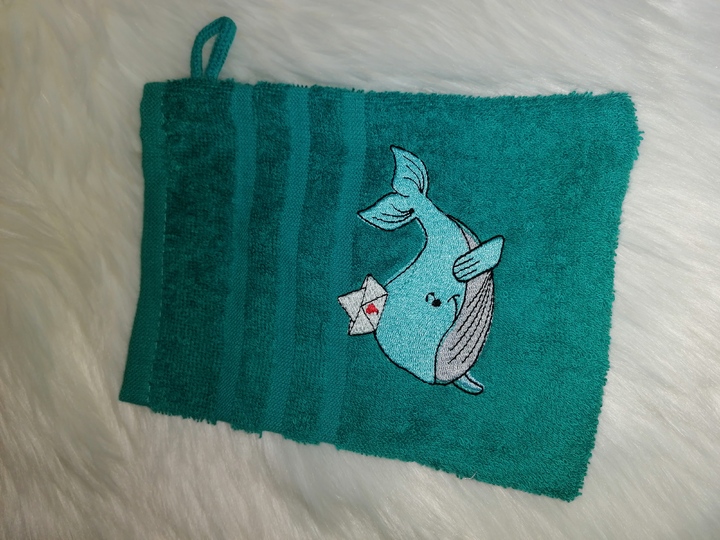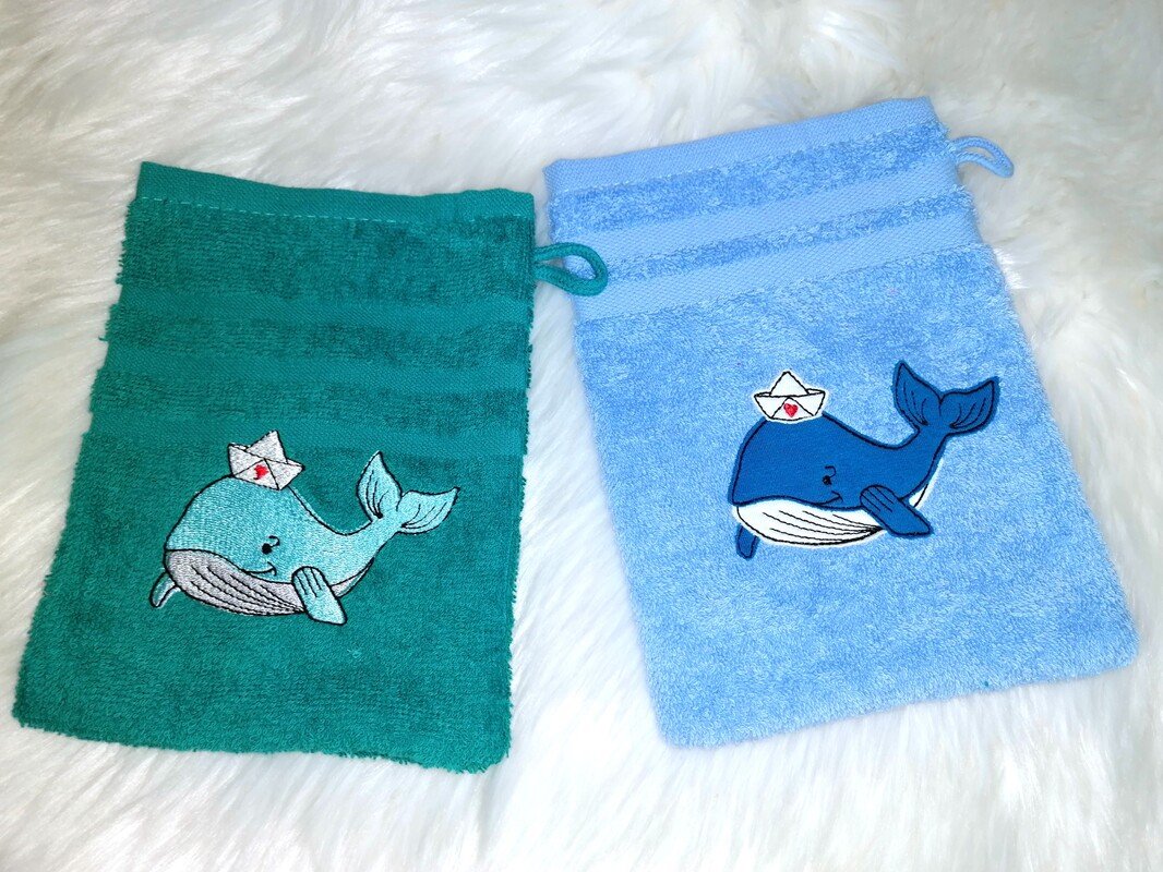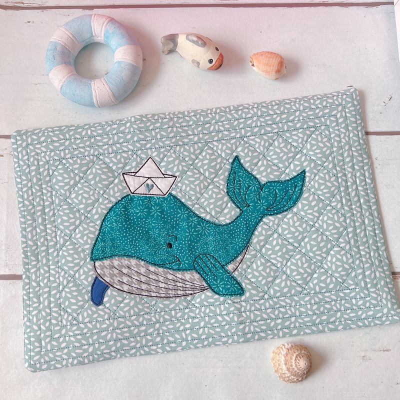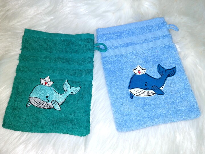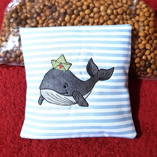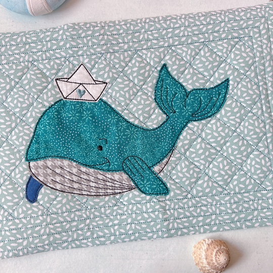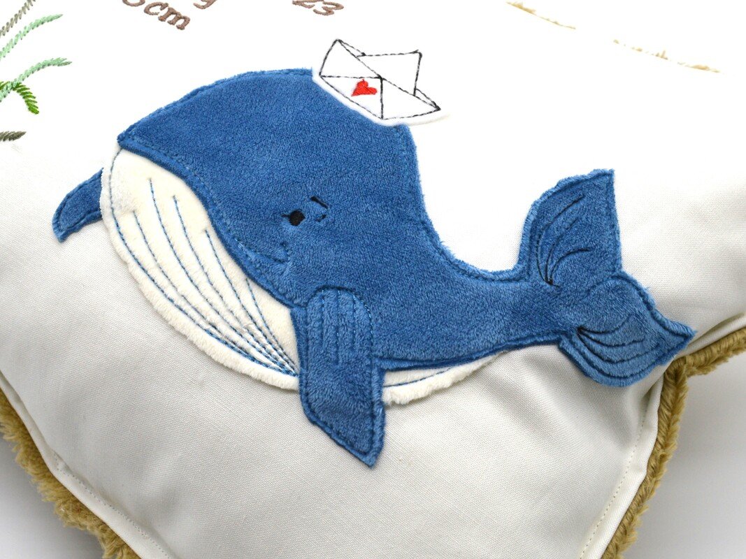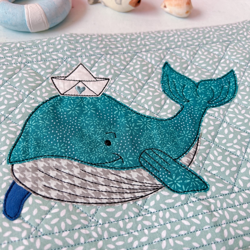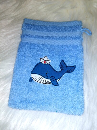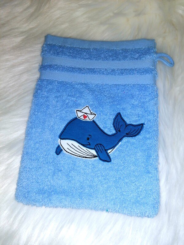 Süßer Wal als doodle Applikation mit Hütchen und Herz. Die einzelnen Bereiche werden während dem Sticken mit Stoff unterlegt. Dazu ist in dem SET ein kleiner Wal voll ausgestickt enthalten.