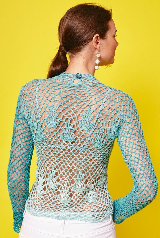 Ein wunderbarer Sommer-Pulli. Durch das sehr transparente Netzmuster ist er eher Accessoires als Pullover oder Oberteil. Ob mit farblich passendem Bh oder Hemdchen darunter getragen oder schnell mal über einem Kleid oder dem Bikini/ Badeanzug angezogen: dieser Pulli ist vielseitig und sieht immer mega aus. Das Netzmuster wird mit Luft- und festen Maschen gearbeitet. Auch die Blütenmotive befinden sich innerhalb innerhalb des Netzmusters. Hierfür gint es eine extra Häkelschrift. Die Ärmel, ganz schlicht im Netzmuster, werden von oben nach unten gearbeitet und haben in schmalen, langen Unterarm. Du häkelst mit N Nr 3,5 und Garn von Lana Grossa. In der Anleitung findest du die Größen 34, 42 und 44.