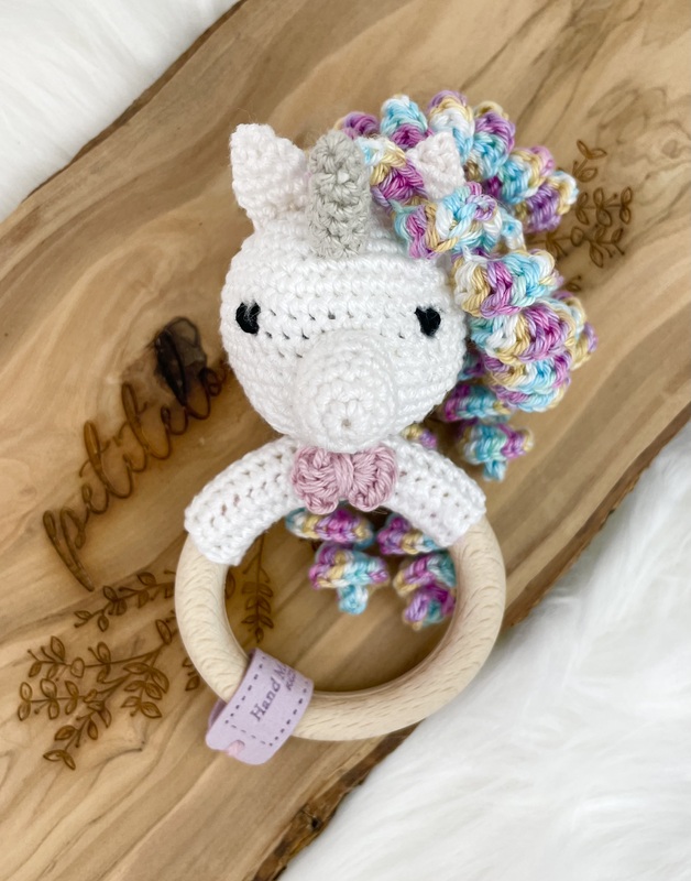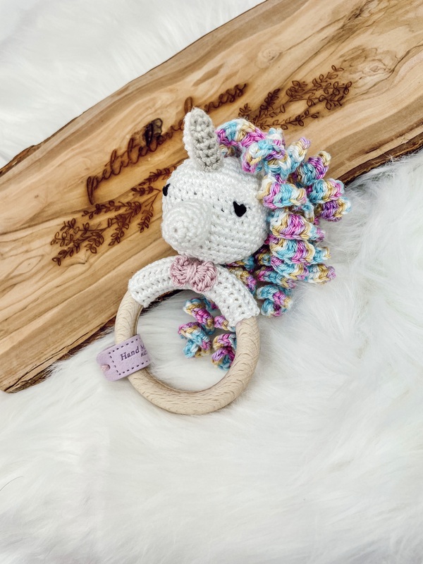 Du erhältst eine Anleitung zur Herstellung meines Beißrings / Greiflings mit dem kleinen Einhorn Maja, der gleichzeitig eine kleine Rassel ist.