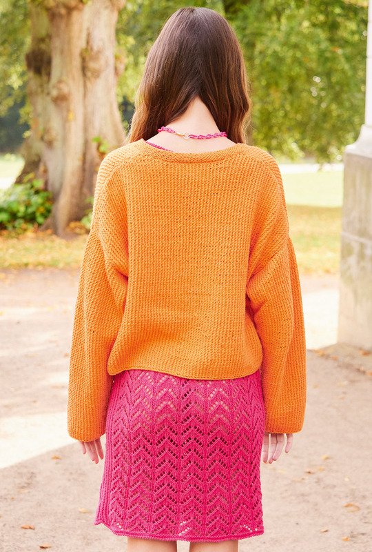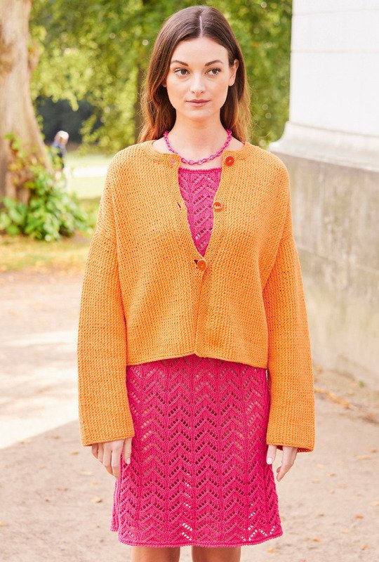 Klassische Eleganz trifft auf femininen Schnitt: Die weit und kurz geschnittene Jacke im Strukturmuster und das körperbetonte, feminine Kleid im zarten Ajourmuster sind abwechslungsreich zu stricken und wunderbar zu tragen. Mit dieser Anleitung haben Sie gleich zwei tolle Projekte, die super zusammenpassen, aber auch allein ausgeführt werden können. Gestrickt wird mit unterschiedlicher Nadelstärke im gleichen Garn von Junghans-Wollversand. Alle Teile werden einzeln von oben nach unten gestrickt und zum Schluss zusammengenäht. Durch die besondere Musterwahl bietet die Jacke eine schlichte, gerade Passform, während das Kleid sich durch das elastische Ajourmuster perfekt an den Körper schmiegt.