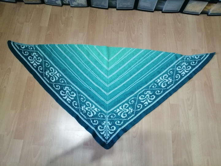 Dieses Tuch besticht durch die schöne Bordüre am äußeren Rand. Es ist ein gleichschenkeliges Dreieckstuch.