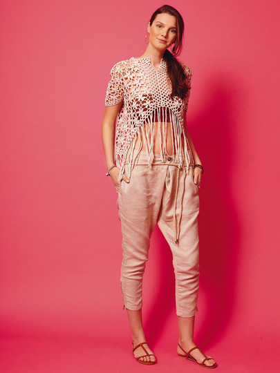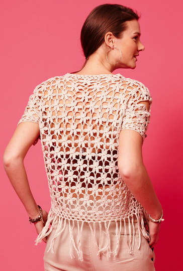 Wow! Vielseitig tragbar und immer im Rampenlicht: Dieses Oberteil geizt nicht mit Besonderheiten. Zum taillenkurzen Rückenteil werden die Vorderteile mit Schrägung von der Taille zur Brustlinie gearbeitet. An die vorderen Kanten werden quer Streifen im Filetmuster gehäkelt, die dann miteinander verbunden werden. Lediglich der Ausschnittschlitz bleibt offen. Beim Einnähen der Ärmel bleiben die mittleren 10 cm für die Cut-Outs offen. Zwei Reihen des Filetsmuster an alle Kanten gehäkelt geben dem Teil einen schönen Rahmen. Zum Schluss werden nur noch die langen Fransen in das Filetmuster eingeknüpft. Es wird mit Nadel Nr 4 und Garn von Junghans Wollversand gearbeitet. Das Oberteil passt den Größen 36, 38 und 40.