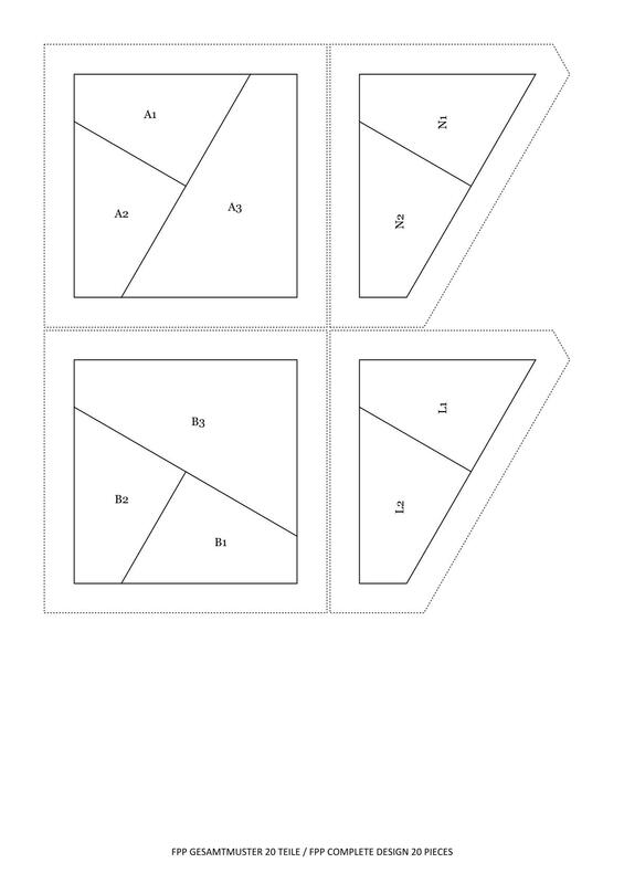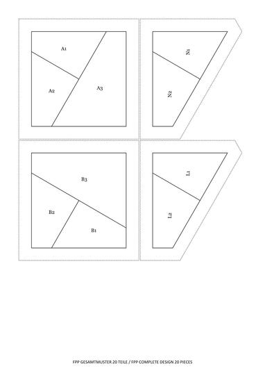 2) „FPP BLOCK 40 CM (Gesamtansicht des Musters, FPP-Vorlagen für 1 Block, entsprechende Schablonen für Stoffzuschnitt