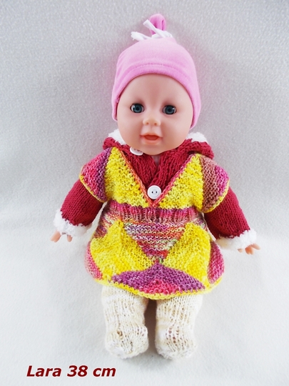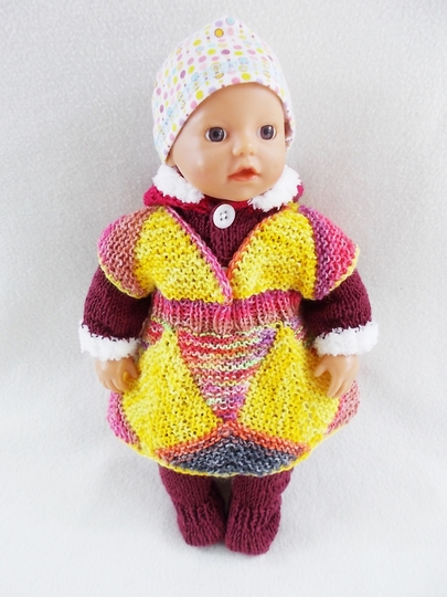 Du findest in meinem Shop auch passende Puppensachen, die sehr gut zum Kleidchen passen, zum Beispiel den Overall, den du auch ohne Kapuze und Fell stricken kannst. So hast du gleichzeitig einen Pullover und eine Strumpfhose zum Darunterziehen. Über folgenden Link findest du den Overall - ebenfalls in mehreren Größen: