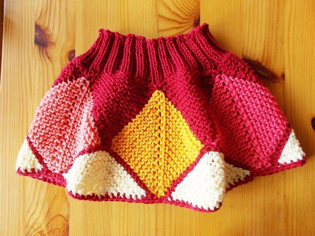 Falls du noch keine Erfahrung mit dem Patch-Stricken hast, macht das gar nichts. Es ist wirklich ganz einfach. Die verschiedenen Teile werden einzeln aneinandergestrickt und führen dann zum Gesamtergebnis. Damit ist vieles möglich, der Schnitt lässt sich super in der gewünschten Weise modellieren. Das längere Röckchen hier ist beispielsweise schön weit und glockig geschnitten.