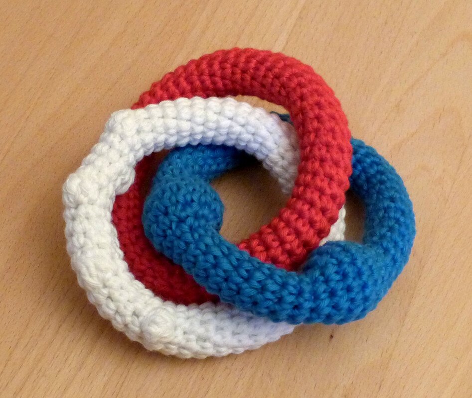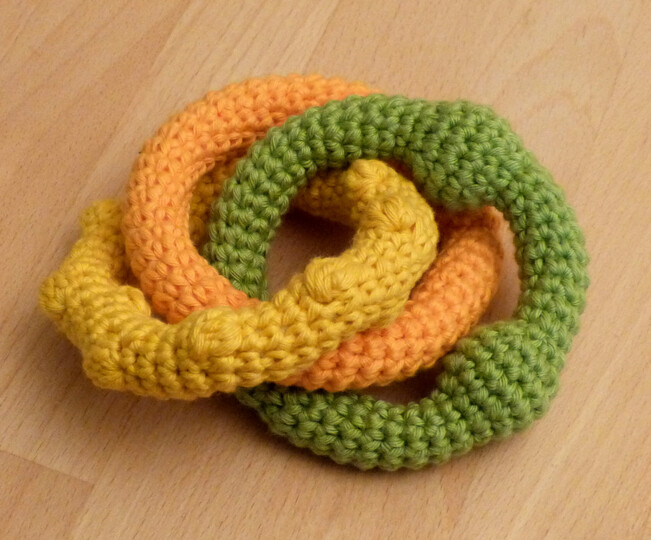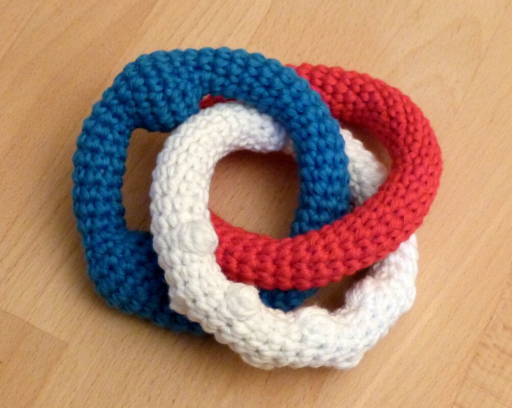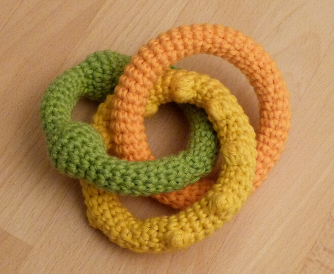 Bei Verwendung von Baumwollgarn mit einer Lauflänge von 90m/50g und Nadelstärke 3 wird jeder Ring ca. 10 cm groß. Zusätzlich benötigst du Füllwatte und eine kleine Rasseldose oder ein Glöckchen.