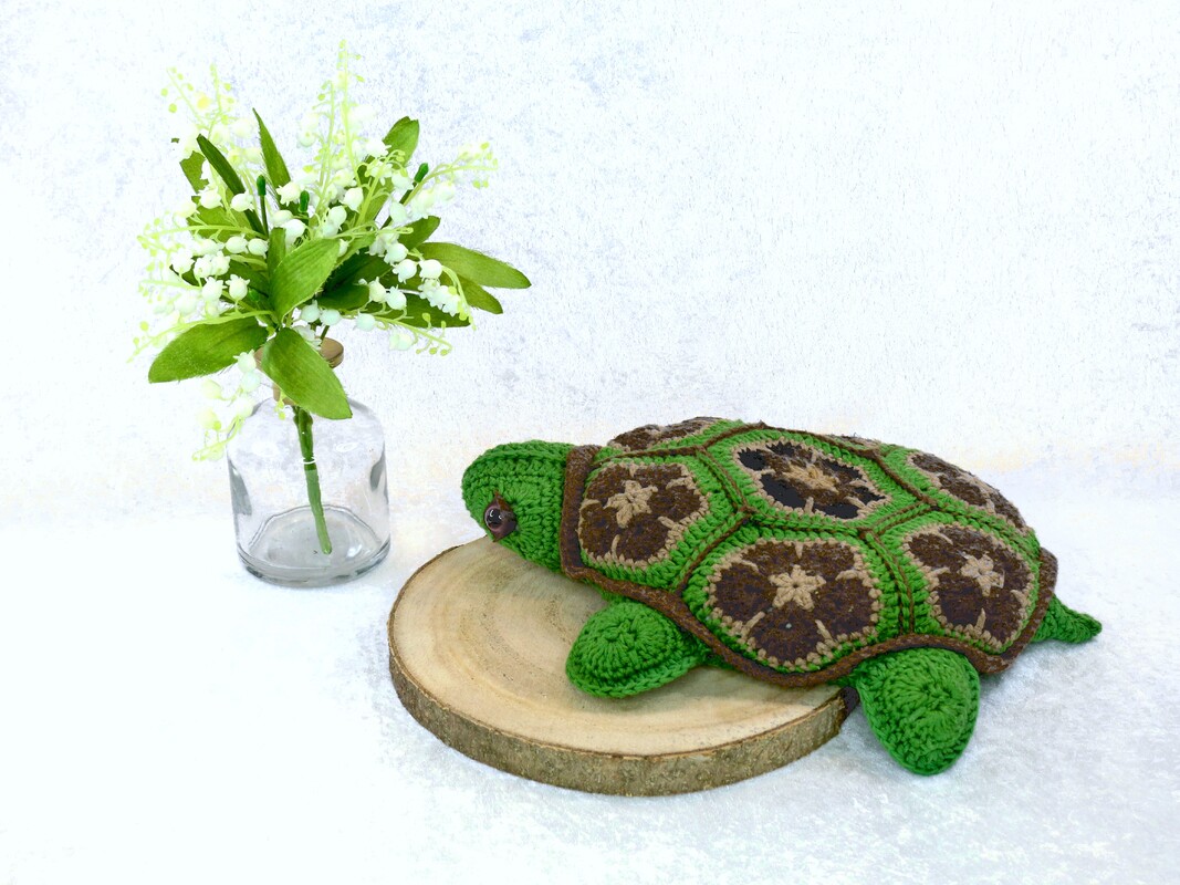 Thilda ist ein kleines Kissen in Form einer Schildkröte. Sie wird mit 25 African Flowers in verschiedenen Größen gehäkelt. Du kannst daraus auch ein Wärmekissen machen, indem du innen ein Körnerkissen platzierst.
