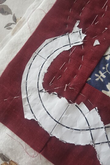Die Kissenvorderseite besteht im Herzteil aus 16 Quadraten, die mittels der FPP-Technik vorbereitet und zu einem Block (von 30cm x 30 cm Fertigmass) zusammengenäht werden. Dieser bunte Block wird mit einem breiten Stoffstreifen allseitig umrahmt. Auf diesem Rahmen wird das Steppmuster ausgeführt.