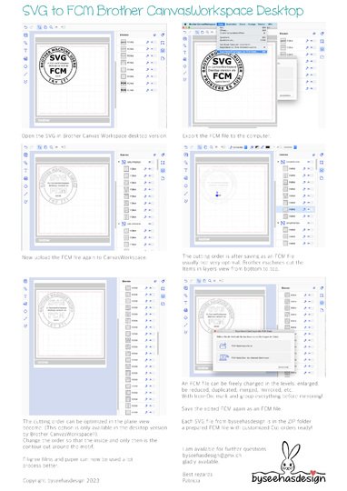 Die FCM Datei kann problemlos immer wieder erneut in Brother CanvasWorkspace hochgeladen, verändert und anschliessend erneut als FCM Datei gespeichert mit Brothergeräten verwendet werden.