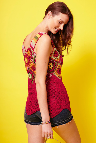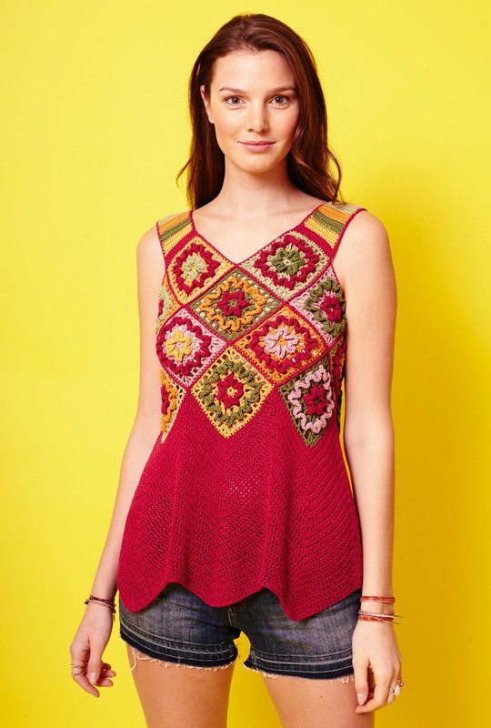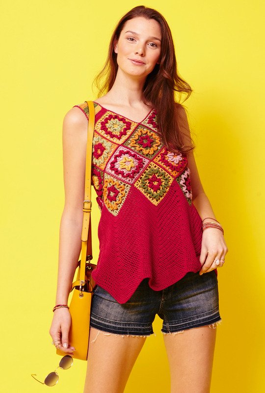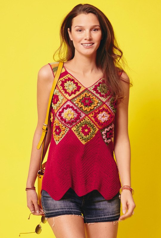 Welch aufsehenerregendes Top! nicht nur die strahlenden Farben fallen gleich ins Auge. Auch die Machart ist eine ganz besondere. Zunächst werden die bunten Granny-Squares gehäkelt. Hierfür genau nach Anleitung und Häkelschrift arbeiten. Anschließend werden sie laut Schnittplan aneinander gelegt und mit festen Maschen zusammengehäkelt. Damit wäre das Bustier schon mal fertig. Nun wird von oben nach unten gehäkelt. An die untere Kante des Bustiers nun das Wellenmuster in Purpur arbeiten. Hier kann jetzt die Länge individuell gestaltet werden. Anschließend noch die Träger an das Bustier arbeiten und die Kanten umhäkeln: Dein neues Top ist fertig. Du häkelst mit Nadel Nr 4 und Nr 4,5 und Garn von Lana Grossa. Die Anleitung gilt für die Größe n34 und 36. Übrigens, möchtest du das Top etwas größer, dann häkle einfach mit einer Nadelstärke dicker.
