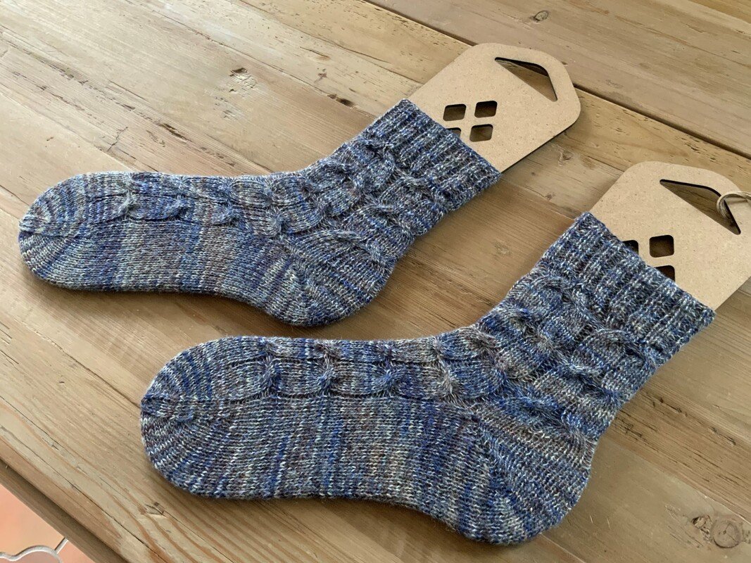 „Bastienne“, Socken mit einem einfachen Zopfmuster. Die Socken werden von oben nach unten gestrickt. Ich habe die Ferse als Bumerangferse gearbeitet und eine Bandspitze gestrickt und beschrieben. Ferse und Spitze können jedoch auch anders ausgeführt werden.