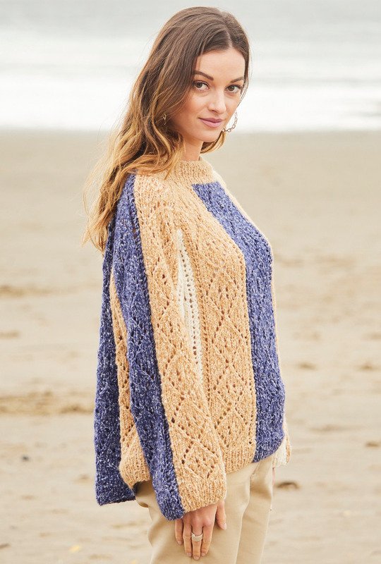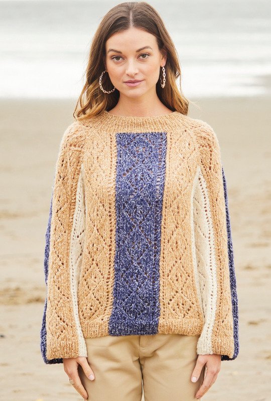 Schicke Ajourmusterstreifen treffen auf lässigen Raglanschnitt. Dieser Pullover ist mit Nadelstärke 5,5 toll zu stricken, die vertikalen Farbstreifen sorgen für Abwechslung. Das Rückenteil ist komplett in Blau gearbeitet. Das Garn für dieses Prachtstück gibt es bei ONline. Besonders raffiniert ist der kleine Turtleneck-Kragen. Alle Teile werden einzeln von unten nach oben gestrickt und zum Schluss zusammengenäht. Der Raglanschnitt sorgt für eine tolle Passform und ist mit der in der Anleitung enthaltenen Beschreibung und dem detaillierten Schnitt ganz leicht umzusetzen. Eine ausführliche Strickschrift macht das Muster zum Kinderspiel. Gestrickt werden kann dieser Pullover in den Größen 38/40 und 44/46.