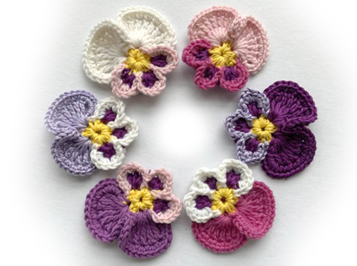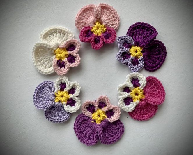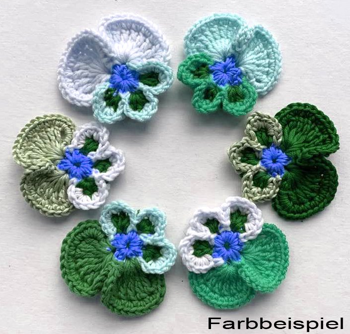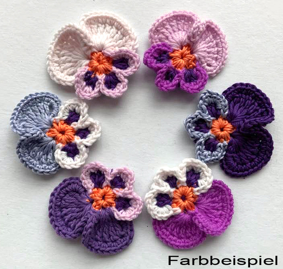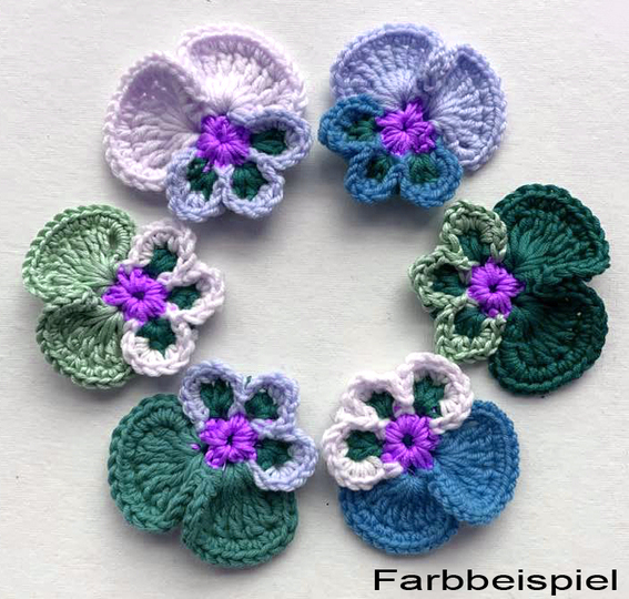 Die Hübschen Stiefmütterchen sind super für Mützen, Kinderkleidung...Stirnbänder..usw..Diese Stiefmütterchen sind bisschen eine Fummelarbeit...aber um so schöner ist das Ergebnis!