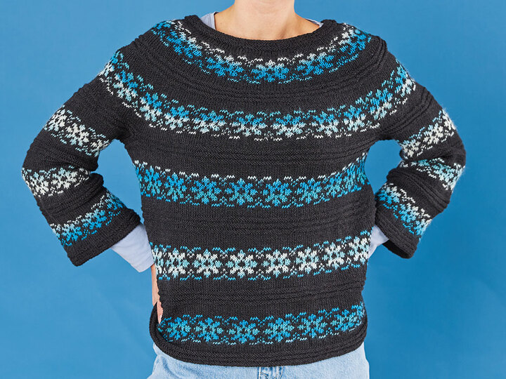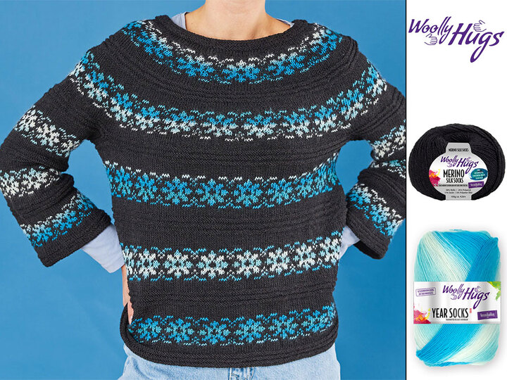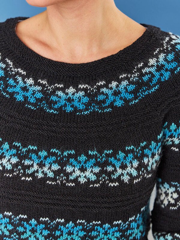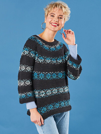 Unsere Strickanleitung für einen Pullover mit Rundpasse und Einstrickmuster ist das ideale Projekt für alle Strickbegeisterten. Das Verlaufsgarn verleiht dem Pullover eine moderne Note und hält dich dabei warm. Der schicke Look lässt sich perfekt zu verschiedenen Outfits kombinieren.