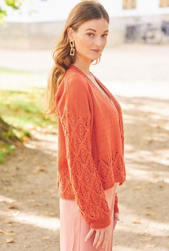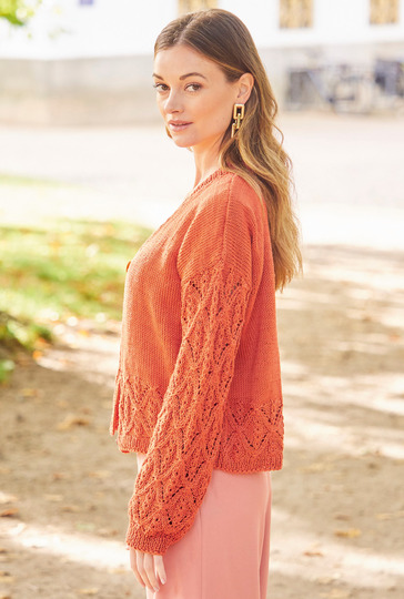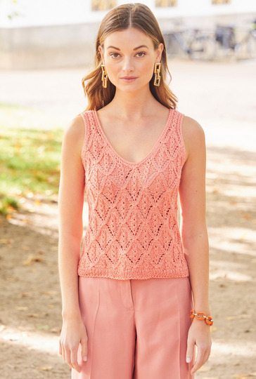 Ein sommerliches Twin-Set bestehend aus einem Top mit Rauten-Ajourmuster und einer legeren Jacke, welche das Muster des Tops erneut aufgreift. Perfekt zusammen getragen, aber auch einzeln ein Hingucker. Bei beiden Modellen werden die Teile einzeln von unten nach oben gearbeitet und zum Schluss zusammengenäht. Das raffinierte Muster aus Umschlägen, betonten Abnahmen und Verkreuzen von Maschen ist durch die sehr detaillierte Strickschrift gar nicht schwer nachzuarbeiten. Das jeweilige Garn für Jacke und Top findest du bei Pro Lana. Die Anleitung kann in den Größen 36–40 oder 42–46 (Jacke) und 36/38, 40/42 oder 44/46 (Top) nachgestrickt werden.