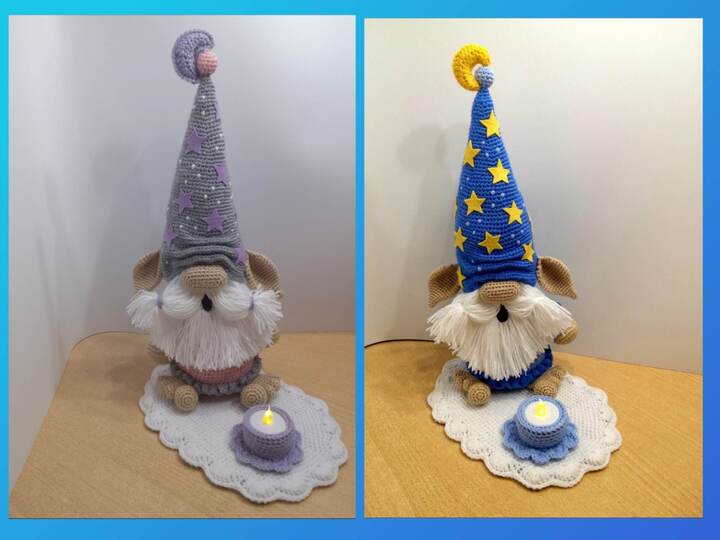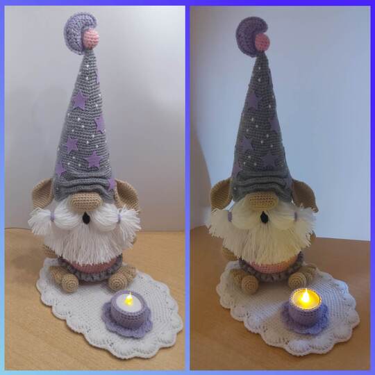 Den Gute Nacht Wichtel habe ich mit Woll Butt Versailles und einer Nadelstärke von 2,0 gehäkelt. Der Wichtel hat bei mir eine Größe von ca. 42 cm, die Wolkenunterlage ist ca. 26 cm lang und ca. 18 cm breit.