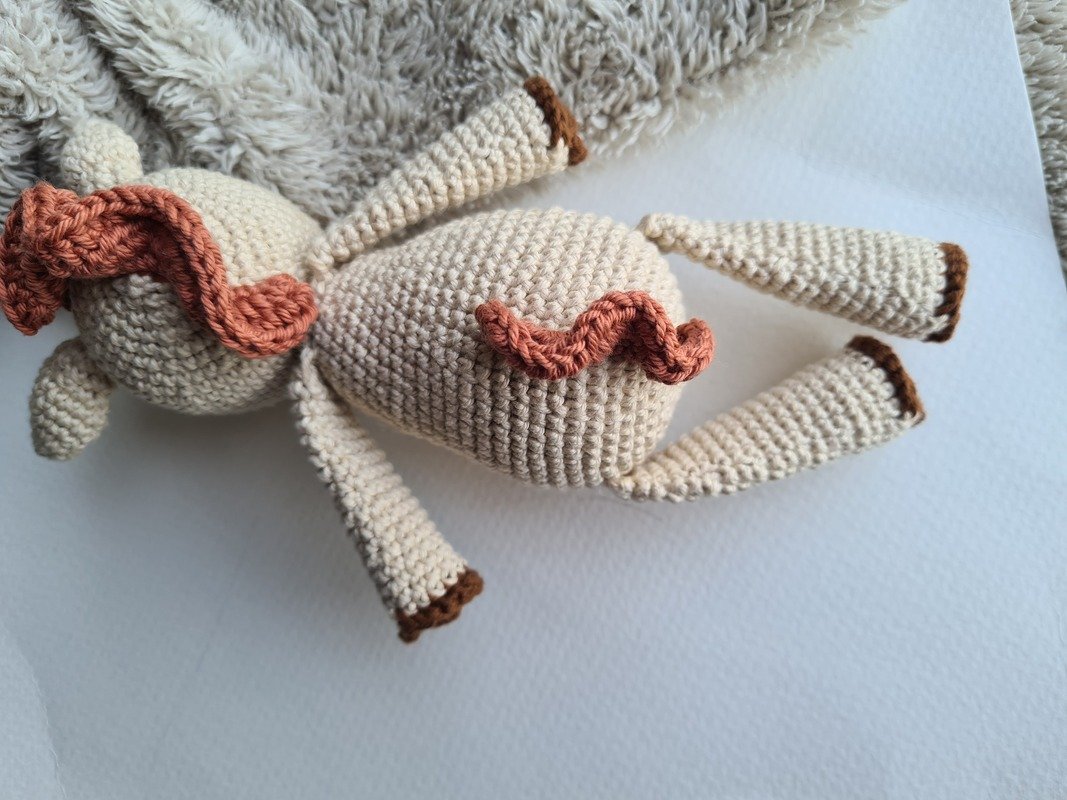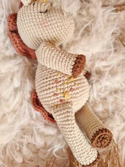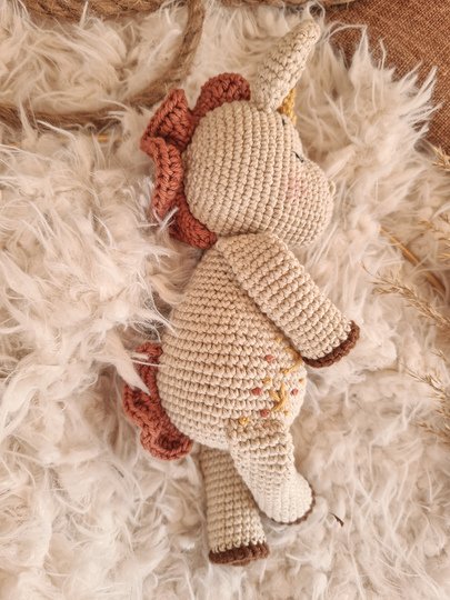 Der Körper wird weitestgehend in einem Stück gearbeitet. Ohren und Kopf müssen angenäht werden. Schweif und Mähne werden angehäkelt.