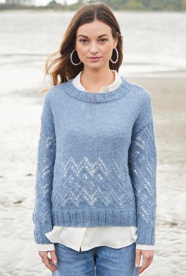 Manchmal muss es ganz klassisch sein. Was würde da besser passen, als dieser kuschlig-weiche Pullover. Die klassische Form wird durch das zarte Ajourmuster zauberhaft aufgelockert. Durch die überschnittenen Schultern und der gerade Schnitt kann man sich ganz auf das Muster konzentrieren. Die Umsetzung ist dank detailierter Strickschrift gar kein Problem. Alle Teile werden einzeln von unten nach oben gestrickt und zum Schluss zusammengenäht. Der Kragen ist, ebenso wie das Bündchen, besonders breit im Rippenmuster gearbeitet und sorgt für den perfekten Sitz des Pullovers. Gestrickt wird in Nadelstärke 5,5 mit doppeltem Faden. Das macht das Endergebnis in Größe 38/40 oder 44/46 noch viel, viel kuscheliger.