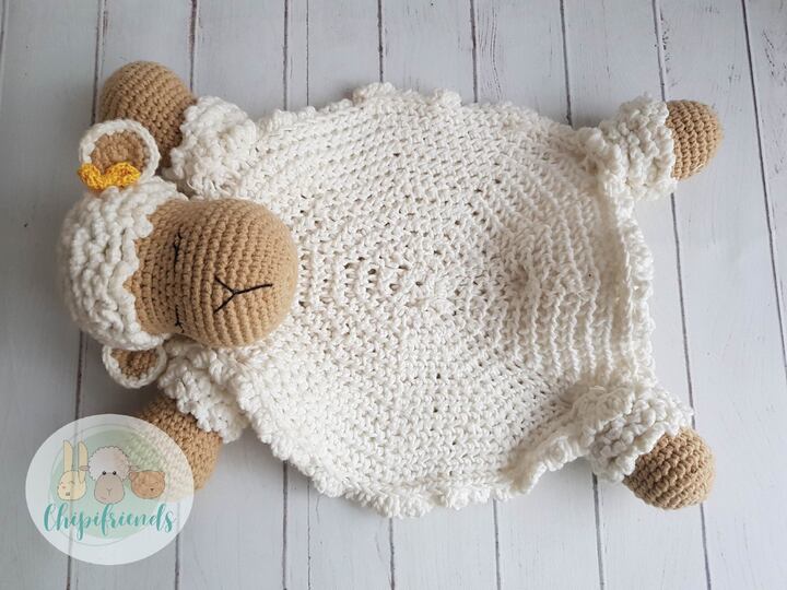 Das PDF enthält eine Anleitung mit leicht lesbaren Bildern zur Herstellung einer niedlichen Kuscheldecke Schaf.