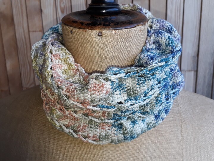 Der Loop wird in Spiralen gehäkelt und sieht aus wie zerknülltes Papier. In sich verdreht mit kantigem Look.