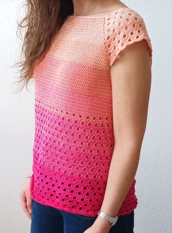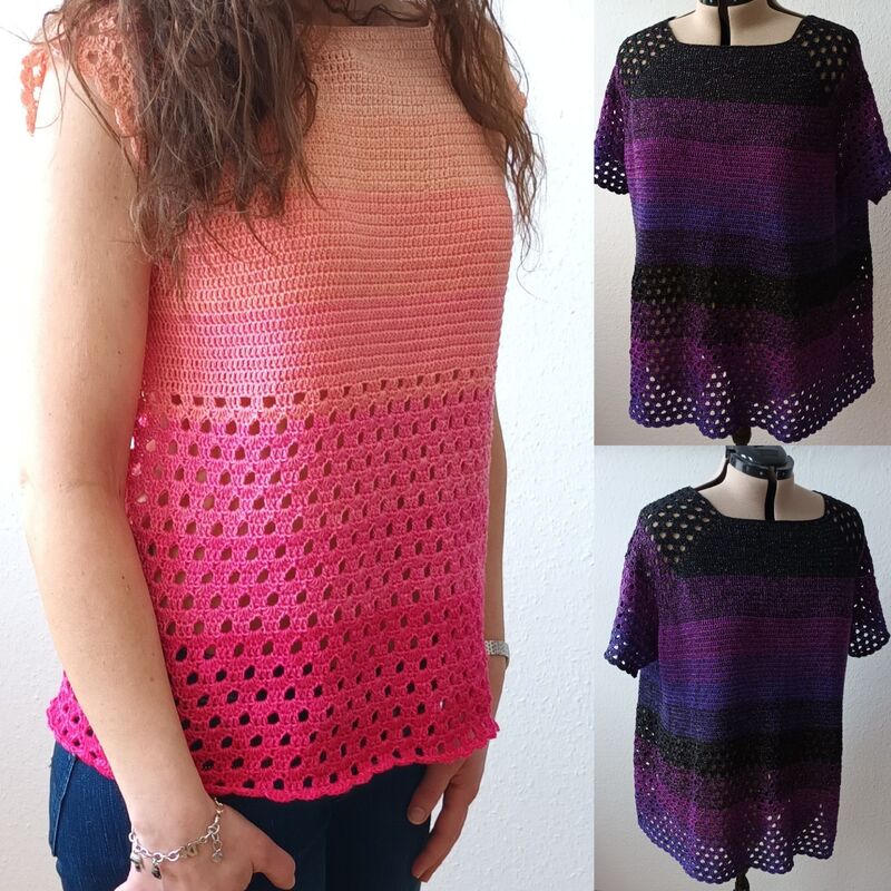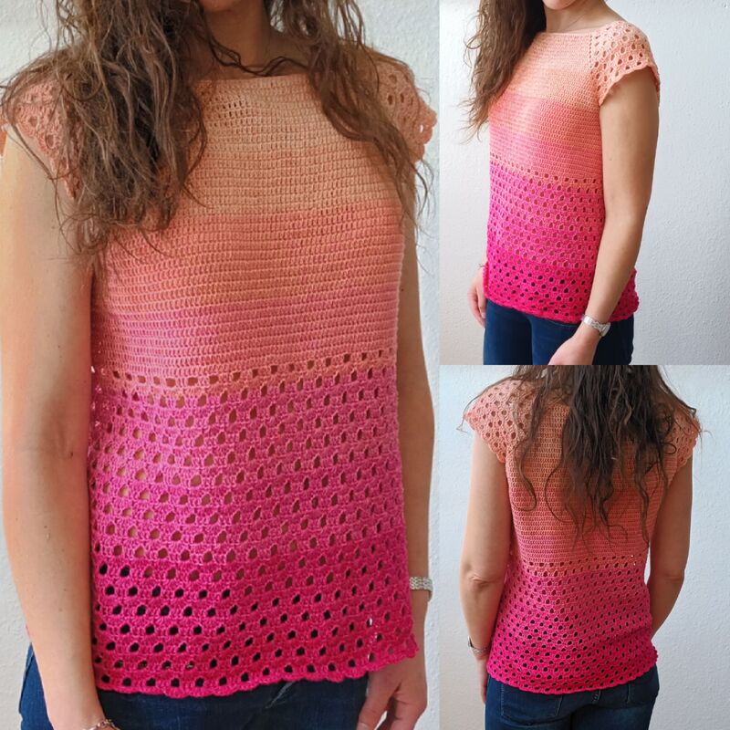 Nach dieser Anleitung kannst Du dir ein hübsches, modisches Shirt mit und ohne Ärmelchen häkeln.